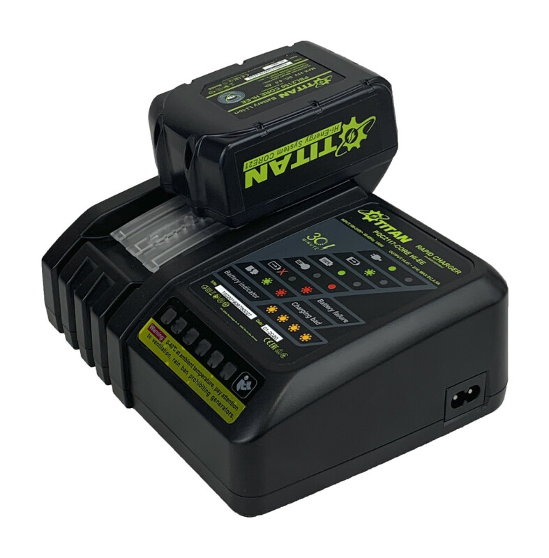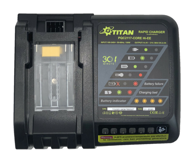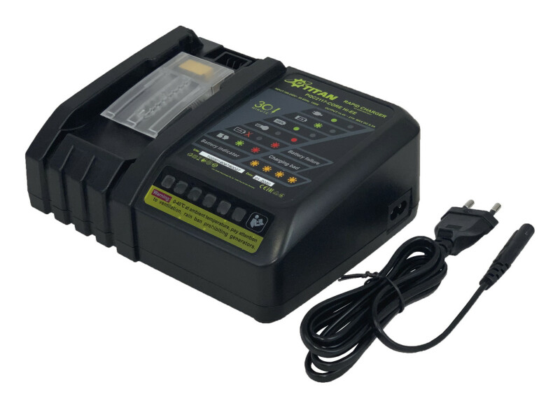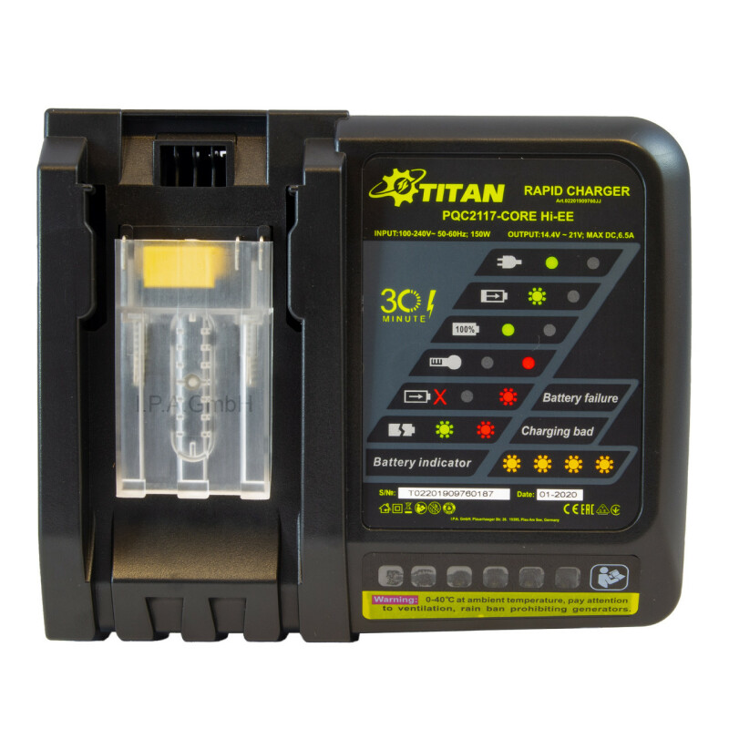 Быстрое зарядное устройство TITAN PQC2117-CORE Hi-EE – данное устройство используется для быстрого и правильного заряда батарей аккумуляторных инструментов линейки TITAN CORE SYSTEM 21 и аналогичных по конструктиву аккумуляторов различных производителей с современным типоразмером (Makita LXT BL ) Особенности быстрого зарядного устройства TITAN PQC2117-CORE Hi-EE: Световые индикаторы информируют как о состоянии аккумулятора, так и о процессе зарядки или поддержания заряженного аккумулятора в рабочем состоянии; Электроника самостоятельно оценивает напряжение и температуру аккумулятора во время процесса зарядки и регулируя ток заряда обеспечивает правильный циклический заряд, а встроенный индикатор готовности покажет, когда Ваш аккумулятор будет полностью заряжен и готов к работе; Встроенный кулер интенсивно охлаждает устройство и аккумуляторную батарею в процессе заряда, исключая перегрев Li-ion элементов; Подходит для батарей BBL2150-CORE с чипом, PBL2130-CORE Hi-EE, PBL2150-CORE Hi-EE, PBL2160-CORE Hi-EE, PBL2190-CORE Hi-EE, PBL21120-CORE Hi-EE.а также Makita BL1830B BL1840B BL1850B BL1860B Комплект поставки: Быстрое зарядное устройство TITAN PQC2117-CORE Hi-EE; Гарантийный талон; Упаковка – картонная коробка.