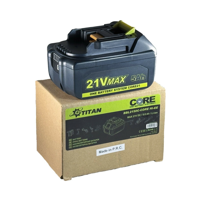 ЗАРЯЖАТЬСЯ ОТ ЗАРЯДНЫХ УСТРОЙСТВ MAKITA И TITAN CORE С ЧИПОМ КОНТРОЛЯ ЗАРЯДКИ . Особенности аккумулятора TITAN BBL2150C-CORE: Аккумуляторная батарея BBL2150C-CORE мощностью 5 Ач Li-ion обеспечит увеличение мощности инструментов, отличается надежностью и высокой продолжительностью работы. Интеллектуальная технология “CORE”, которая оценивает состояние каждой ячейки; Индикатор заряда; Прочная конструкция корпуса; Возможность работы при температуре до -15°; Патентованная система защиты батареи, которая контролирует температуру блока аккумуляторов; При малейшем превышении сработает защита, которая размыкает цепь – исключит поломку аппарата; Совместимость со всеми инструментами TITAN CORE 21 В.MAKITA 18V PROFI-TEC 20V REVOLT 20V Комплект поставки: Аккумулятор TITAN BBL2150C-CORE 5 Ач — 1 шт;