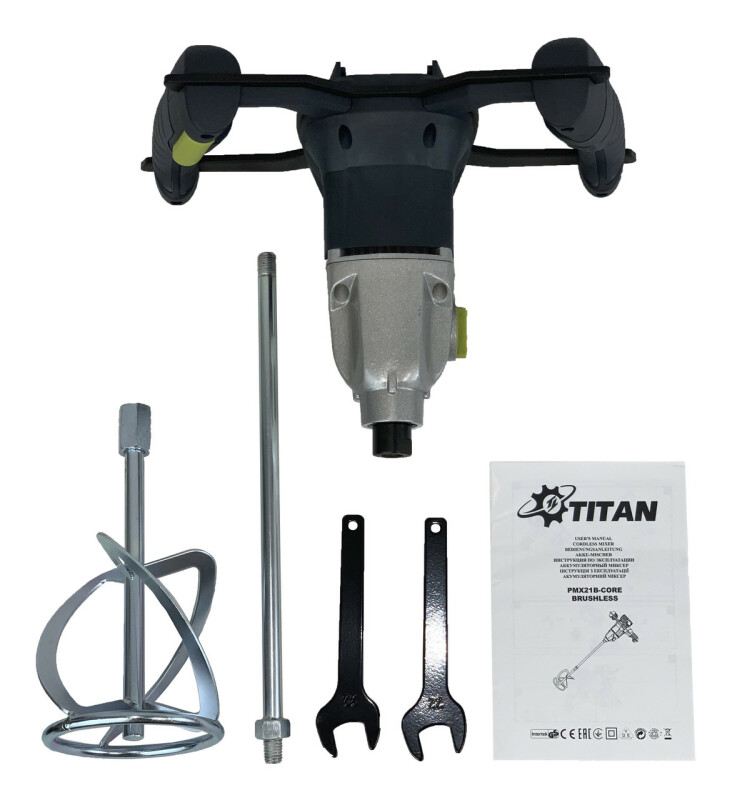 Посадка аккумулятора-тип MAKITA 18V TITAN SYSTEM CORE 21 PMX21B-CORE Brushless аккумуляторный миксер. Технические характеристики Частота вращения на холостом ходу: 1 скорость: 0-450 об/мин. Частота вращения на холостом ходу: 2 скорость: 0-720 об/мин. Мощность двигателя аналогична: 1400 Вт Патрон М14 Максимальный диаметр венчика 140 мм Бесщеточный двигатель 21В. Максимальный крутящий момент - 550 Нм. Крепление оснастки - квадрат 1/2". Питание от батарей - 18-21В Вес без батареи - 3,3 кг. Вес с венчиком и батарей 5Ач - 4,9 кг. Преимущества ● Аккумуляторный строительный миксер TITAN PMX21B-CORE, совместим со всеми батареями системы TITAN CORE 21,MAKITA.PROFITEC.GRAND. а так же с помощью системы адаптеров, можно использовать батареи почти всех производителей аккумуляторного инструмента (адаптеры поставляются опционно). ● Строительный миксер TITAN PMX21B оснащен мощным бесщеточным двигателем и сравним по производительности аналогичному строительному миксеру мощностью 1400Вт. ● Двухскоростной редуктор обеспечит, высокий крутящий момент на первой скорости и высокую производительность на второй скорости. ● Плавный пуск предотвращает разбрызгивание смеси на старте. ● Регулировка частоты оборотов, позволяет точно выбрать скорость вращения для той и иной смеси и более аккуратно выполнить работу. ● Металлический корпус редуктора обеспечивает надежность и хороший отвод тепла во время длительных нагрузок. ● Сбалансированная прочная конструкция миксера с верхним расположением ручек позволяет оператору, комфортно не наклоняясь и без особых усилий перемешивать смеси. ● Эргономичные рукояти на металлической раме с мягким резиновым противоскользящим покрытием, не скользят в руке, гасят вибрацию. Комплектация ● PMX21B Миксер - 1шт. ● Пара запасных щеток, 1 пара ● Ключ 2 шт. ● Венчик 120мм, 1шт ● Инструкция по эксплуатации, 1шт