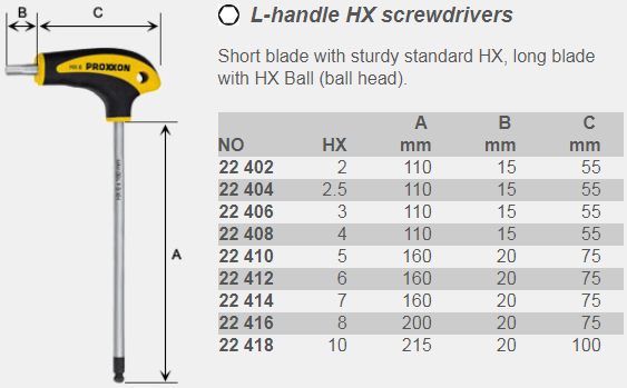 PROXXON 22406, Отвертка HX с L-образной рукояткой Если для затяжки или ослабления винтов требуется большой момент, лучшим решением будет отвертка с L-образной рукояткой. Эргономичная и асимметричная ручка упрощает работу в непрерывном режиме. Его двухкомпонентная конструкция с мягкими зонами уменьшает следы давления и в то же время обеспечивает оптимальную передачу крутящего момента. Размеры легко читаются на стержне (лазерная маркировка) и ручке. Градуированные размеры рукоятки соответствуют необходимому крутящему моменту для соответствующего размера лезвия. С поперечным отверстием для подвешивания. Специальная резиновая ручка с антипригарным покрытием, стойкая к маслам и кислотам. Легко считываемые размеры благодаря процессу лазерной маркировки на матово-хромированных валах из специальной стали из хром-кремний-марганцево-молибденового сплава. Непрерывная закалка и снятие напряжений со сбалансированным соотношением жесткости на кручение и прочности. Обработанный черный наконечник для максимальной точности установки винтов. Также предотвращает скольжение инструмента. Трудно получить доступ Винты с внутренним шестигранником можно вкручивать под рабочим углом до 25 ° с HX Ball. При использовании винта гнездо короткого лезвия, используется более длинный хвостовик как «рычаг» для экстремального крутящего момента. Короткое лезвие с прочным стандартным HX, длинное лезвие с HX Ball (шаровой головкой).