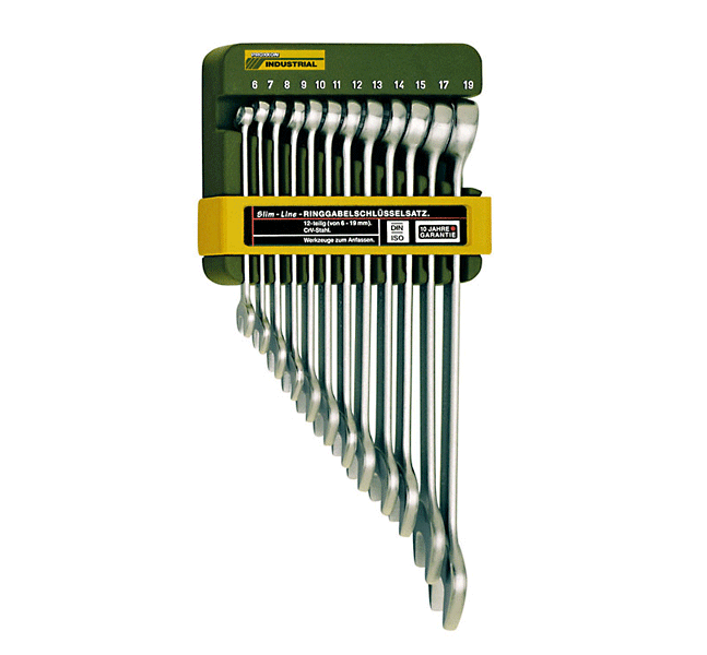 PROXXON 23820, Набор накидных ключей SlimLine из 12 предметов. Включая держатель. Гаечные ключи SlimLine. Практические инструменты. Кованая сталь CrV. Тщательно закаленный и покрытый гальваническим покрытием. С хорошо читаемыми размерами. Смещение кольцевой головки 15 °. Размеры 6 - 7 - 8 - 9 - 10 - 11 - 12 - 13 - 14 - 15 - 17 и 19 мм. Каждый гаечный ключ имеет четко обозначенное место для хранения. Пластиковый держатель также имеет отверстия для крепления. NO 23 820set Оптимальная защита поверхности за счет двойного никелирования и одинарного хромирования. Легко удерживается, гладкая поверхность. С прочной лазерной надписью и четко читаемыми размерами в мм. Полированные головы: тонкие и тонкостенные. Характеристики крутящего момента все еще превышают требования DIN / ISO. Допуски на размеры лучше, чем требуются DIN / ISO. Каждая деталь калибруется и проверяется.