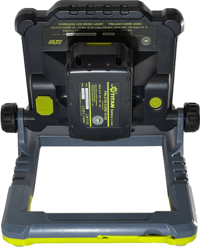 Аккумуляторный гибридный прожектор TITAN PML621-CORE ACDC Внимание: Поставляется без аккумулятора Характериcтики: Режим работы от аккумулятора (АС) - Батарея Li-ion 18-21 В*** Режим работы от аккумулятора (DС) - 220-240 В -50 Гц Мощность - 20 Вт Тип лампы - LED Яркость - 2800 люмен Цветовая температура - 6500К Вес - 1.3 кг Комплектация Прожектор Адаптер тип №3. TITAN CORE21 & MAKITA 18В. ОТДЕЛЬНО ВЫ МОЖЕТЕ ПРИОБРЕСТИ АДАПТЕРЫ Артикулы для заказа; PA24-N1, тип №1. DEWALT & Milwaukee. PA24-N2. тип №2. Black & Decker, PorterCable, STANLEY. PA24-N3. тип №3. TITAN CORE21 & MAKITA 18В. PA24-N4. тип №4. BOSCH 18В.
