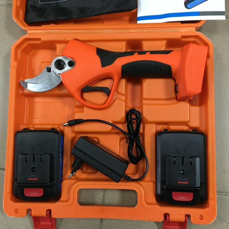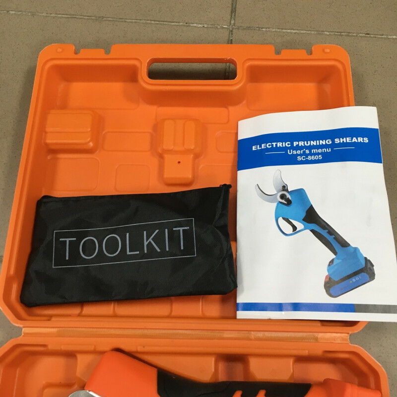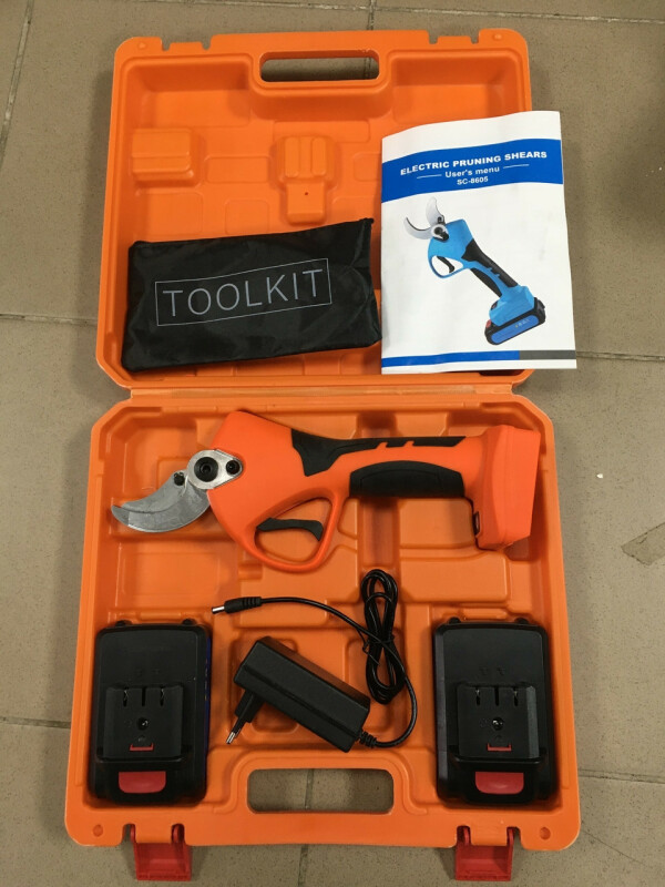 Характеристики Аккумуляторного секатора SC-8605 Максимальный диаметр реза: 0-40 мм. Рабочее напряжение: 21.В. Максимальная мощность: 1050 Вт. Емкость аккумулятора: литиевая батарея 2 Ач. Время автономной работы 2-3 ч. Время зарядки: 2 ч. Температура эксплуатации: -10…+50° С Материал лезвий: сталь SK-5. Вес - 1,3 кг. В комплект набора входит: Электросекатор – 1 шт. Аккумуляторная батарея – 2 шт. Зарядное устройство. Пластиковый чемодан. Отвертка 1шт. Ключ-головка. Шестигранник. Шлифовальный камень. Тюбик с маслом для смазывания инструмента.