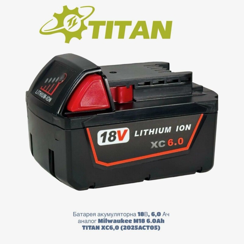 TITAN Профессиональная серия аккумуляторов Аккумуляторная батарея TITAN XC6,0. Технические характеристики Рабочее напряжение аккумулятора: 18 В. Емкость аккумулятора: 6.0 А/ч. Технология аккумуляторных элементов: 18650 Li-Ion . Тип аккумуляторных элементов: Высокотоковые. Производитель элементов: EVE. Количество элементов: 10. Емкость элемента: 3 Ач. Напряжение элементов: 3,6 В. Совместимость: Milwaukee M18 Fuel. Индикация ошибок: Есть. Индикатор заряда батареи: Есть. Защита от перегрева: Есть. Защита от переразряда: Есть. Защита от перезаряда: Есть. Защита от короткого замыкания: Есть. Поддержка быстрой зарядки: Есть. Вес батареи: 0,75 кг. Гарантия на батарею: 12 мес. Преимущества ● Аккумуляторная батарея TITAN XC6,0 совместима со всеми инструментами системы Milwaukee M18 Fuel, а так же заряжается на оригинальных зарядных устройствах Milwaukee. ● Инновационная система защиты батареи контролирует уровень заряда, температуру и ток, способствуя улучшению производительности, долговечности батареи и общего времени автономной работы. ● Система оптимальной зарядки регулирует три ключевых параметра – ток, напряжение и температуру – для продления срока службы батареи. Дополнительная информация: ● Производитель: TM "TITAN" I.P.A. GmbH Plauerhaeger Str. 26. 19395, Plau Am See, Germany ● Модель: XC6,0. ● Артикул: 2025ACT05.