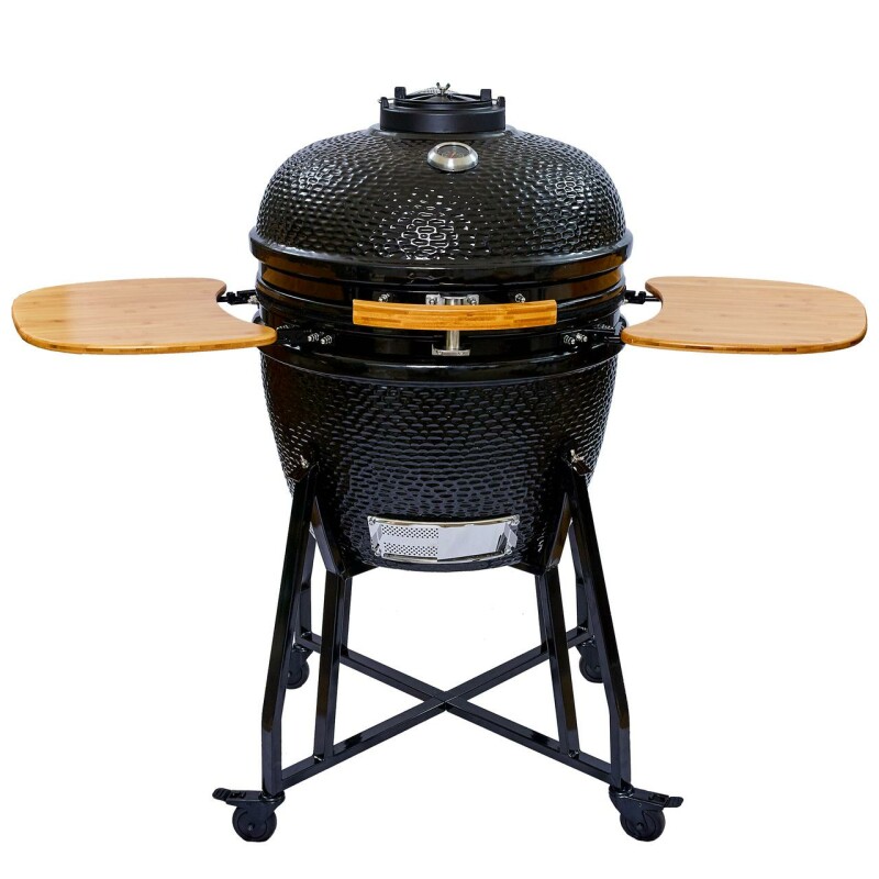 Покрытие - глазурь, покрытие апельсиновой корки Характеристики: Диаметр 61 см, Габариты - 63×81 см, вес 140кг, встроенный термометр для точного контроля температуры; шкала термометра расписана под приготовление различных блюд; имеет три зоны: копчение, жарка, интенсивная жарка или обжигание; колеса с тормозным механизмом и на поворотной оси обеспечивают манёвренность и устойчивость. Описание: Керамический гриль Red Sun это - гриль, печь, тандыр, духовка, коптильня . Приготовленная пищя, приобретает удивительный вкус и сохраняет сочность продуктов. Вы можете жарить, коптить и выпекать с соблюдением точной температуры до 400 С, чрезвычайно безопасна в использовании, так как керамическая поверхность не сильно не нагревается, в отличии от металла, а источник тепла изолирован в керамической камере, которая легко очищается, элегантный корпус покрытый естественной глазурью, которая сохраняет его внешний вид и легко вытирается начисто, без химических чистящих средств. Внутри, остаточное тепло сжигает любой накопившийся жир - как в самоочищающихся духовках. Потребление угля в 3 раза меньше, чем у обычных грилей. Избавит от необходимости добавлять уголь во время приготовления пищи. Керамические стены с высокой точностью удерживают заданную температуру. Вы можете томить мясо как в русской печи 12 часов, не переживая, что оно подгорит и можете жарить настоящие стейки. Поставляется в красном, оранжевом и черном цвете