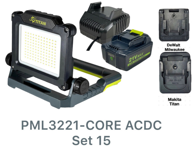 Аккумуляторный гибридный прожектор TITAN PML621-CORE ACDC Внимание: Поставляется без аккумулятора Характериcтики: TITAN SYSTEM CORE 21 PML3221-CORE ACDC. Аккумуляторный Гибридный прожектор. Технические характеристики Источник света: 120 белых светодиода SMD, 30 Вт. Интенсивность света, 3 режима: высокая / средняя / низкая. Световой поток (люмен): 3500/2000/1000 Цветовая температура 5500К. Питание от батарей 18-21В. Питание от сети 220В/50Гц. Преимущества ● Складное основание и ручка с 4 монтажными магнитами. ● Встроенный USB-порт 5В, 1А для зарядки телефонов. ● Встроенный поворотный крючок для подвешивания. ● Прочный корпус из АБС-пластика. ● Возможность для стационарного крепления. ● Адаптер для подключения к сети 220В (в комплект не входит) артикль для заказа PA24-220. ● 4 совместимых адаптера позволяет использовать прожектор с батареями большинства ведущих производителей аккумуляторного инструмента, в комплект включено 2 адаптера, тип 1 и 3. Артикулы для заказа; PA24-N1, тип №1. DEWALT & Milwaukee. PA24-N2. тип №2. Black & Decker, PorterCable, STANLEY. PA24-N3. тип №3. TITAN CORE21 & MAKITA 18В. PA24-N4. тип №4. BOSCH 18В. Комплектация Прожектор Адаптер тип №3. TITAN CORE21 & MAKITA 18В. Подходит для аккумуляторов: TITAN SISTEM CORE 21 Dewalt 20V Black & Decker 20V RYOBI 18V ONE+ , также совместим с никелевыми батареями RYOBI 18V MAKITA 18V