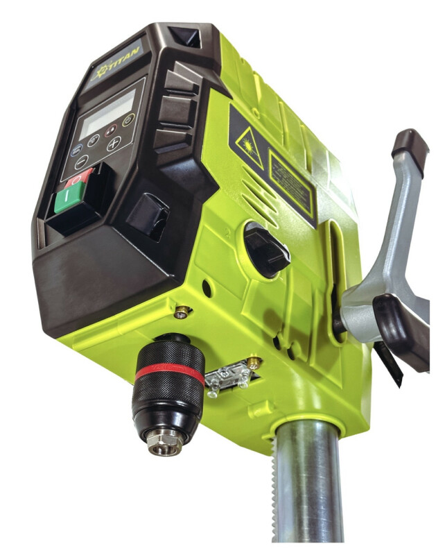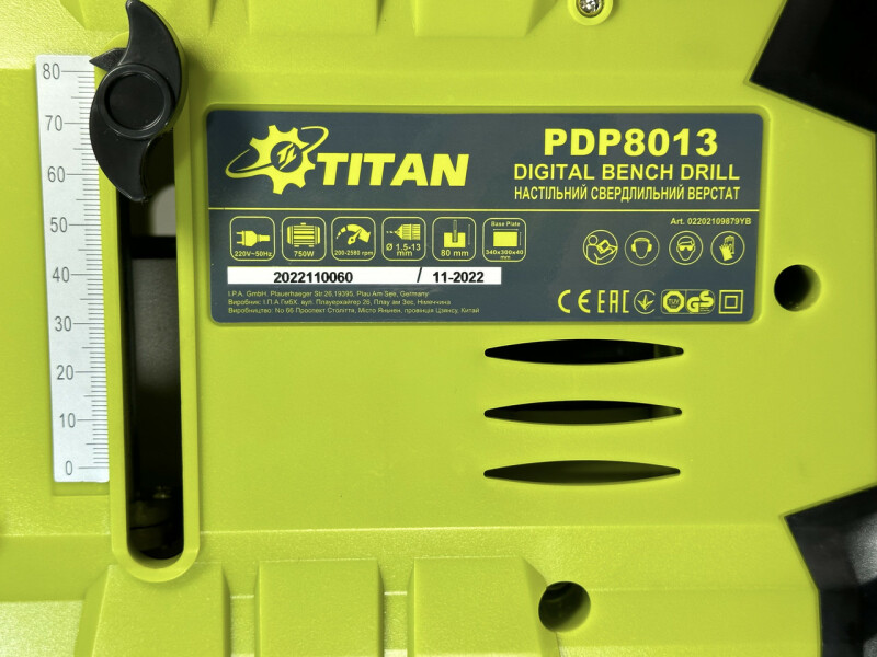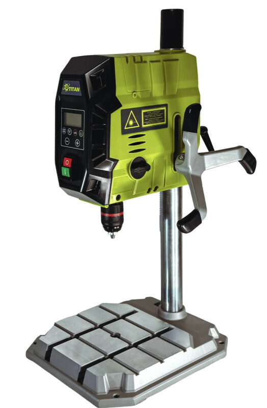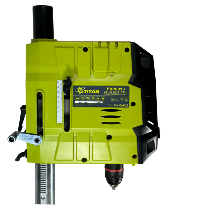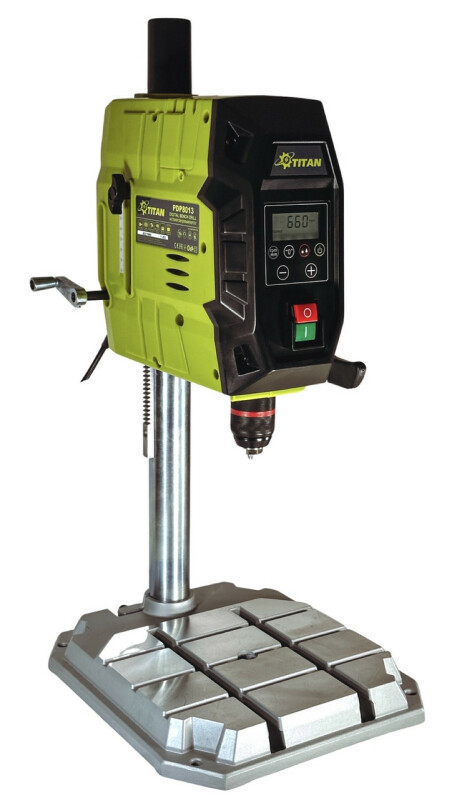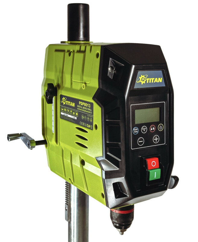 TITAN Профессиональная серия Сверлильный станок PDP8013 Технические характеристики Частота вращения на холостом ходу: 1 скорость 200-850 об/мин. Частота вращения на холостом ходу: 2 скорость 600-2580 об/мин. Потребляемая мощность 750 Вт Крепление инструмента самозажимной патрон 1,5-13мм Диаметр сверления: сталь 16мм Диаметр сверления: дерево 40 мм Ход сверла 80 мм. Габаритные размеры опорной плиты длина 340 мм ширина 300 мм высота 40 мм Длина кабеля 2,0 м Вес 11 кг Преимущества ● Профессиональный сверлильный верстак TITAN PDP8013 предназначен для точного сверления отверстий. ● Двухскоростной редуктор обеспечит, высокий крутящий момент на первой скорости и высокую частоту вращения на второй скорости. ● Якорь и статор с надежной защитой от абразивной пыли. ● Функция реверса, правое/левое вращение. ● Регулировка частоты вращения ● Металлический корпус редуктора, обеспечивает долгий срок службы. ● Высококачественный металлический быстрозажимной патрон 13мм с функцией Auto lock, обладает высокими удерживающей способностью и точностью. ● Встроенный лазер для точного позиционирования. ● Светодиодная подсветка рабочей зоны. ● LCD дисплей для точной настройки режима работы, отображение выбранной скорости и глубины сверления. ● Система поддержания постоянных оборотов под нагрузкой. ● Большая опорная плита с пазами, для установки тисков с точной фиксацией (тиски не входят в комплект поставки) . Комплектация ● Сверлильный станок PDP8013 - 1шт. ● Инструкция по эксплуатации - 1шт. ● Самозажимной патрон 1,5-13мм, 1шт