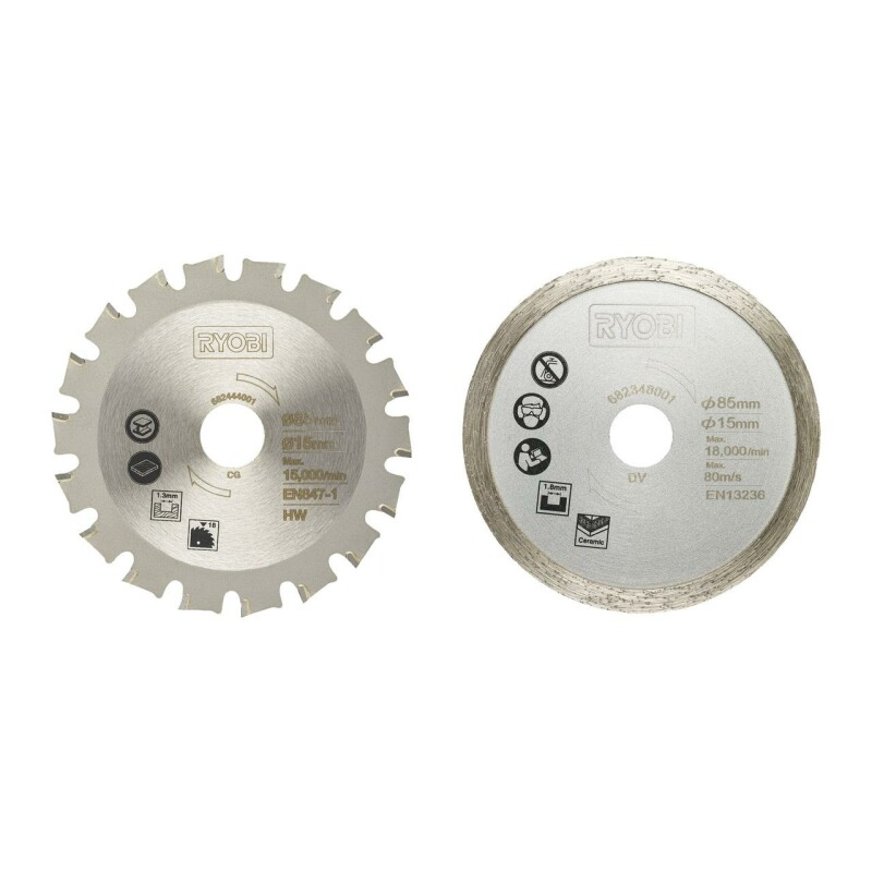 2 диска для универсальной пилы: 1 х диск по дереву и металлу, 1 х диск по плитке Для R18MMS-0. Наружный диаметр 85мм, посадочное отверстие 15мм. Подходит для универсальных пил других брендов. Идеально для резки дерева, пластика, металла и керамической плитки. Комплектация Диск пильный по дереву/цветным металлам (85х15 мм, 18 зубьев, толщина 1.3 мм) - 1 шт; Диск алмазный по керамике (85х15 мм, 1.8 мм) - 1 шт. Габариты и вес в упаковке Вес 0.12 кг Размеры Д: 12.30 см х Ш: 20.40 см x В: 0.70 см