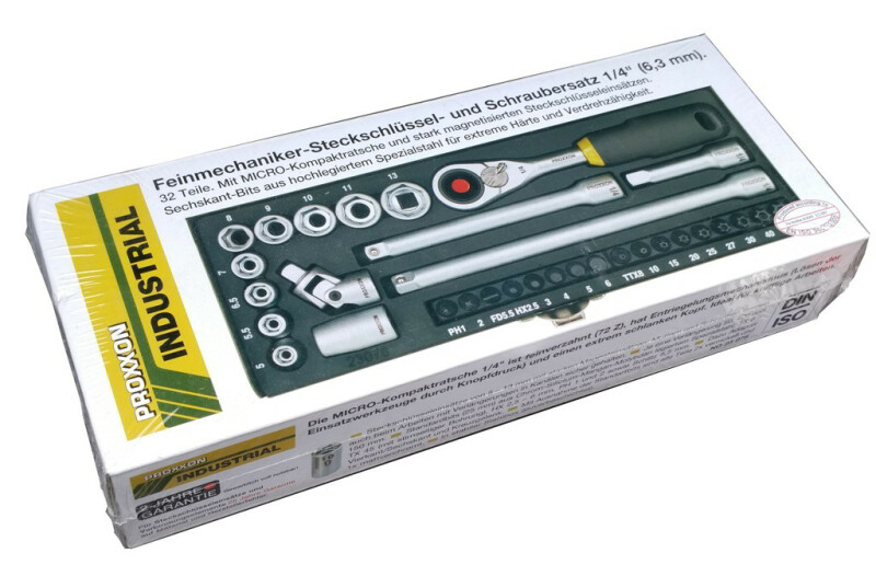 Набор инструментов, адресованный к очень требовательным профессиональным пользователям. Вот описание только некоторых ключевых преимуществ: Все основные металлические элементы выполнены из нержавеющей хром-ванадиевой стали CrV 31 CrV3 с содержанием соединений углерода для сохранения высокой твердости по всей величине инструмента, Все наконечники, ключи и биты изготовлены из хром-кремний-марганец-молибдена. ГОЛОВКИ: работа осуществляется через специальную систему Driver, проходящую на плоскостях болтов и гаек, а не только на изгибах. Эта система гарантирует откручивание даже сильно прикипевших болтов без их повреждения. Идеально подходит также на ослабление ранее уже поврежденных болтов во время работы инструментами плохого качества. шестигранные, в размере углубления насадок, так что сильно утопленные винты уже не составляют проблемы, супер тонкостенные головки и абсолютное отсутствие риска их разрыва, слегка фрезерованный внутренний край облегчает наложение колпачка, поверхность оптимально защищена двойным никелированием и хромированием. ТРЕЩОТКИ: простая замена инструментов благодаря применению специальной кнопки, в головке трещотки, рукоять-держатель (патент № EP03101656/1 фирмы Proxxon), где применяется специальный вид высококачественного неопрена, отверстие в ручке для удобного хранения на панели инструментов в мастерской. УНИКАЛЬНАЯ СИСТЕМА ОПОЗНАВАТЕЛЬНЫХ ЗНАКОВ: Компания Proxxon применяет уникальную технику нанесения маркировки размеров ключей и головок. Элементы описаны очень четко и никогда не стираются. Набор включает в себя: трещоткой 1/4", насадки SW 5 - 13 мм, удлинитель 50/100/150 мм, биты, L=25 мм: плоские 5,5 мм; Phillips PH 1/PH 2; с шестигранной головкой SW 2,5 - 6 мм; Torx T 8 - T 45, универсальный шарнир, адаптер Позволяет выполнять работу, требующую очень высоких нагрузок и точности, позволяет выполнять множество работ, связанных с переставлением и прокручиванием резьбовых соединений различных размеров. Набор упакован в прочный металлический кейс, где есть место для каждого инструмента. Идеальное сочетание высокого качества и доступной цены.