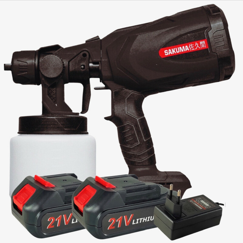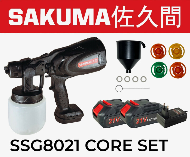 SAKUMA SYSTEM CORE 21 SSG8021-CORE Аккумуляторный краскопульт. Технические характеристики Двигатель 21В. Частота вращения на холостом ходу - 30000 об/мин. Производительность: 200-700 мл/мин Максимальная вязкость - 70 DIN. Диаметр сопла - 1,0/1,5/2,0/2,5мм Объем резервуара - 0,8л Питание от батарей - 18-21В Вес с батарей 2Ач - 1,1 кг Преимущества ● Аккумуляторный краскопульт SAKUMA SSG8021-CORE совместим со всеми батареями системы TITAN CORE 21, а так же с помощью системы адаптеров, можно использовать батареи почти всех производителей аккумуляторного инструмента (адаптеры поставляются опционно). ● Аккумуляторный краскопульт SAKUMA SSG8021-CORE предназначен для нанесения красок, лаков, грунтов, морилок и других растворимых лакокрасочных средств на поверхности любого уровня сложности. ● Аккумуляторный краскопульт SAKUMA может быть использован как опрыскиватель при уходе за садом, позволяя равномерно распылять различные химические средства. ● Наличие регулятора расхода краски и обширного набора форсунок (4+1 в комплекте) обеспечивает возможность адаптации краскопульта к разнообразным задачам, обеспечивая аккуратное и точное выполнение работ по покраске. ● Форсунки, сделанные из качественного пластика, в отличие от коррозии подверженных металлических, будут служить дольше. Комплектация Аккумуляторный краскопульт SSG8021-CORE Форсуна 5шт (1 установлена на краскопульт). Бачок 1шт. Силиконовая прокладка 4шт. Булавка для прочистки. Лейка. Инструкция. Упаковка Поставляется, Аккумуляторный краскопульт SAKUMA SSG8021-CORE SET в комплекте, зарядное и 2 аккумулятора 2Ач