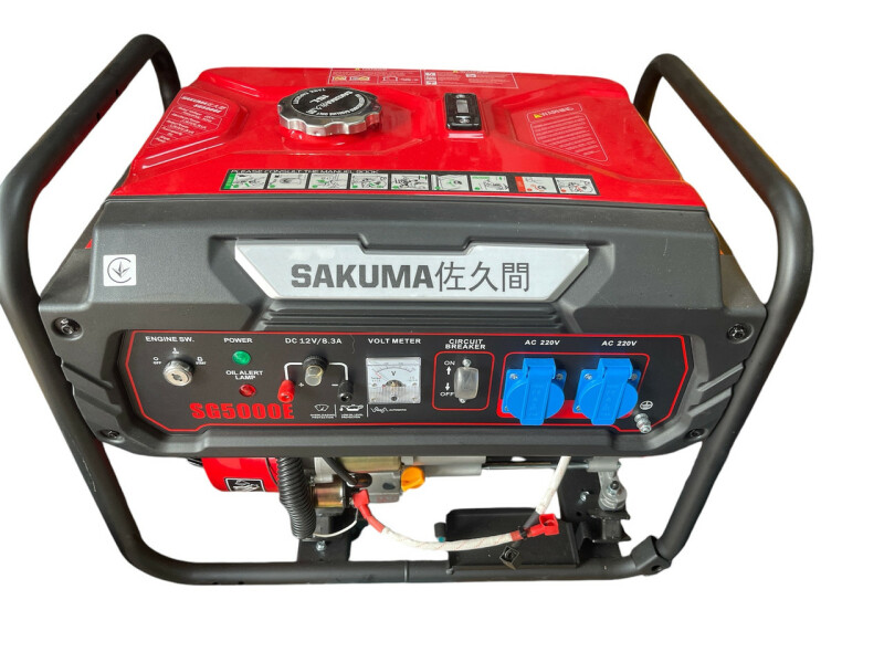 Описание SAKUMA SG5000E — бензиновый генератор, оснащенный автоматическим регулятором напряжения (АVR), который обеспечивает надежное и стабильное напряжение 230 вольт. Это делает его пригодным для питания чувствительных и высокоточных электронных устройств. Для удобства пользователя, генератор SAKUMA SG5000E оснащен электростартером, так же это дает возможность подключать автоматику. Ротор и статор имеет 100% медную обмотку, позволяет использовать генератор длительное время при максимальных нагрузках. Длительная продолжительность работы, до 12 часов без перерыва, доступна благодаря воздушному охлаждению двигателя. На передней панели есть клеммы 12В постоянного тока, они предназначены для зарядки АКБ автомобилей. (Запрещается одновременно использовать клеммы 12В и розетку 220 В). Для удобства перемещения комплектуется набором для транспортировки, который включает в себя: резиновые колеса, стояночные опоры и складную рукоятку. Колеса из цельнолитой резины со стальным основанием, не требуют накачивания и устойчивы к проколам. Особенности SAKUMA SG5000E Датчик низкого уровня масла с индикацией. Датчик перегрузки. Электростартер. Комплектация SAKUMA SG5000E Бензиновый генератор SAKUMA SG5000E Свечной ключ - 1шт. Лейка для масла - 1шт. Комплект колес - 4шт. Аккумуляторная батарея 12В - 1шт. Инструкция по эксплуатации - 1шт. Характеристики Номинальная мощность Вид топлива Система пуска Страна-производитель товара