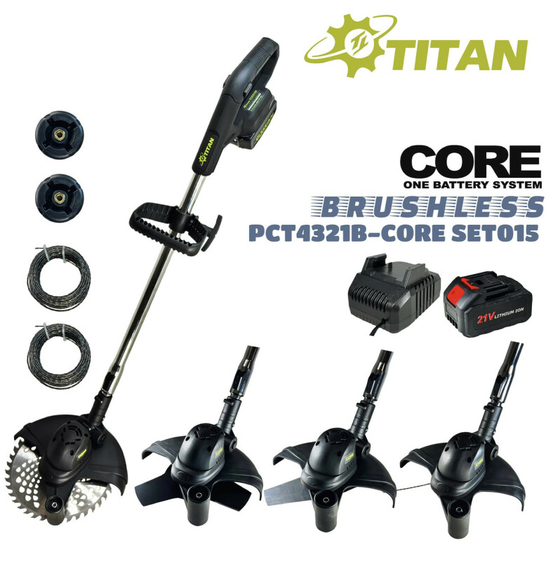 зарядное устройство и 1 аккумулятор SBL5021 5Ач В КОМПЛЕКТЕ TITAN SYSTEM CORE 21 PCT4321B-CORE Аккумуляторный триммер. Технические характеристики Частота вращения 9000 об/мин. Бесщеточный мотор 21В. Максимальный диаметр диска 230 мм. Питание от батарей 18-21В. Вес без батареи – 2,0 кг. Вес из батарей 5Ач – 2,6 кг. Преимущества ● Аккумуляторный триммер TITAN PCT4321B-CORE совместим со всеми батареями системы TITAN CORE 21, а также с помощью системы адаптеров, можно использовать батареи от 18В до 21В, почти всех производителей аккумуляторного инструмента (адаптеры поставляются опционально). ● Аккумуляторный триммер оснащен мощным (800Вт) бесщеточным двигателем постоянного тока с высоким КПД, обеспечивающим большую мощность и продолжительность работы без подзарядки аккумулятора по сравнению со щеточными электродвигателями. Увеличенный срок эксплуатации без обслуживания. ● Аккумуляторный триммер имеет небольшой вес всего 2,6 кг (Вес включая батарею 5Ач), компактную, сбалансированную конструкцию, что позволяет комфортно работать одной рукой. ● Выключатель с блокировкой от случайного пуска, для комфорта и безопасности пользователя. ● Удобная сбалансированная конструкция с металлической телескопической штангой. ● Регулировка наклона кошения, возможность подрезки края газона. ● Защита от переразряда батареи. ● Возможность использования аккумуляторов от 2 до 12 Ач. Комплектация ● Аккумуляторный триммер PCT4321B-CORE - 1шт. ● Нож двухлучевой 230мм 1шт. ● Нож трехлучевой 230мм 1шт. ● Диск-фреза многозубая 230мм 1шт. ● Шпуля для лески 2шт. ● Леска 3м 2шт. ● Универсальный ключ 1шт. ● Боковая ручка 1шт. ● Защита 1шт. ● Направляющий опорный ролик 1шт. ● Наплечный ремень 1шт. Аккумулятор SAKUMA 5ah и зарядное устройство