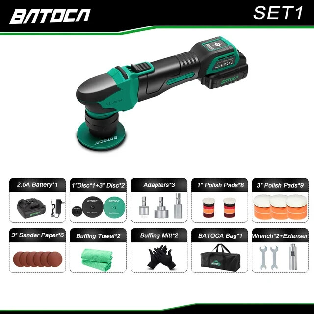 BATOCA S4 SET 1 Аккумуляторная мини-эксцентриковая полировальная машина Batoca B02PO55 (BATOCA S4) Аккумуляторная ротационно-эксцентриковая полировальная машина BATOCA B02PO55 – отличный выбор для профессионалов в сфере авто полировки и восстановления, стремящихся к качеству и эффективности в работе. Технические характеристики Бесщеточный двигатель: 12 В Мощность (эквивалент сетевому аналогу): 300 Вт Напряжение зарядки аккумулятора: 220 В Источник питания: аккумулятор: 12 В. Технология аккумулятора: литий-ионный (Li-Ion) Емкость аккумулятора: 2,5 Ач. Тип полировальной машины: Роторно-эксцентриковая. Ход эксцентрика: 0/3/12 мм Диаметр полировального диска: 30/75 мм Время зарядки аккумулятора: 1,5 часа Время работы от аккумулятора при низкой нагрузке: 1 час Переменная скорость: 4 скорости Частота вращения без нагрузки: 2000-5500 об/мин Мягкий старт: да Сохранение скорости полировки: да Вес без аккумулятора: 0,6 кг Вес с аккумулятором: 0,9 кг Преимущества ● В аккумуляторной полировальной машине BATOCA B02PO55 установлен современный бесщеточный двигатель с высоким КПД, обеспечивающий большую мощность и продолжительность работы без подзарядки. Не требует технического обслуживания. ● Аккумуляторная ротационно-эксцентриковая полировальная машина BATOCA B02PO55, Мощная производительность: бесщеточный двигатель обеспечивает максимальную мощность полировки для тщательной очистки экстерьера и интерьера автомобиля, эксцентриковое движение для достижения результата без голограмм и не перегревая полируемую поверхность, это дает возможность значительно увеличить производительность. ● Полировальная машина BATOCA B02PO55 предлагает три типа привода: ротационный, эксцентрик с ходом полировки 3 мм и эксцентрик с ходом полировки 12 мм. Это позволяет подобрать наиболее подходящий режим для выполнения различных задач. ● Большой выбор аксессуаров и принадлежностей под любую задачу, упакован в практичной сумке для транспортировки. ● Аккумуляторная ротационно-эксцентриковая полировальная машина BATOCA B02PO55 S4 SET2 - обеспечивает удобство точечного ремонта без проводов, позволяя эффективно очищать как экстерьер, так и интерьер автомобиля. ● Суперкомфорт - Система "Push-Press", Быстрая и удобная смена рабочей головки за несколько секунд без использования инструментов. Можно легко переключаться между ротором, эксцентриками с ходом 3 мм и 12 мм или использовать гибкий вал. ● Литий-ионные аккумуляторы емкостью 2,5 Ач, с ячейками 10C, позволяют полировать до 2 часов на одной зарядке для беспроводной обработки деталей, полировки в любом месте без надоедливых проводов. ● Intelligent Control System - Умная система с дисплеем обеспечивает выбор и контроль стабильной частоты вращения без падения мощности, поддерживая заданную скорость в течение 3 минут. Комплектация: Аккумуляторная полировальная машина BATOCA S4: - 1 шт. Батарея 2,5Ач: - 2 шт. Зарядное устройство: - 1 шт. Вал эксцентриковый 3 мм: - 1шт. Вал эксцентриковый 12 мм: - 1шт. Вал роторный 50 мм: - 1шт. Адаптер гибкого вала 30 мм: - 1 шт. Подошва 25мм 1": 1 шт Подошва 75мм 3": 2 шт Губка полировальная плоская 75мм (3"): 3 шт. Губка полировальная плоская волнистая 75мм (3"): 3 шт. Круг полировальный меховой, на липучке 75мм (3"): 3 шт. Губка полировальная плоская 30мм (1"), жесткая, средняя, мягкая: 6 шт. Круг полировальный меховой, на липучке 30мм (1"): 2 шт. Полотенце из микрофибры: 2 шт, Сумка транспортировочная: 1 шт.