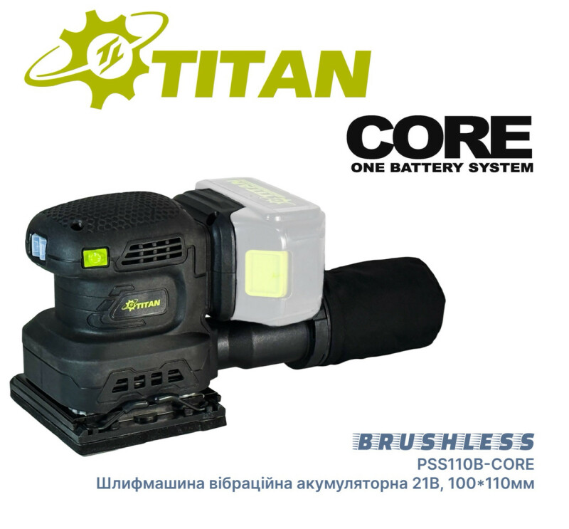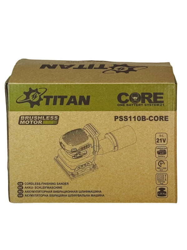 TITAN SYSTEM CORE 21 PSS110B-CORE Brushless Аккумуляторная вибрационная шлифмашина. Технические характеристики Частота вращения на холостом ходу – 7000/8000/11000 об/мин. Бесщеточный двигатель – 21В. Размер подошвы – 100*110мм. Крепление наждачной бумаги – металлические зажимы. Питание от батарей – 18-21В Вес без батарей и аксессуаров – 1,6кг. Вес из батарей 2Ач – 2,2.кг Преимущества ● Аккумуляторная вибрационная шлифмашина TITAN PSS110B-CORE совместима со всеми батареями системы TITAN CORE 21, а также с помощью системы адаптеров, можно использовать батареи от 18В до 21В, почти всех производителей аккумуляторного инструмента (адаптеры поставляются опционально). ● В аккумуляторной болгарке TITAN PAG621B-CORE установлен современный бесщеточный двигатель с высоким КПД, обеспечивающий большую мощность и продолжительность работы без подзарядки. Не требует технического обслуживания. ● Intelligent Control System - Смарт система выбора скорости и контроля стабильной частоты вращения, без падения мощности, с сенсорным управлением. ● Защита от переразряда батареи. ● Эргономичный дизайн с мягкой прорезиненной ручкой обеспечивает уверенный хват и снижает вибрацию. ● Для удаления пыли при использовании шлифмашины можно подключить к пылесосу или воспользоваться удобным мешком, входящим в комплект. Комплектация ● вибрационная шлифмашина TITAN PSS110B-CORE. ● Шлифовальная бумага 100*110мм -3шт. ● Мешок для сбора пыли -1шт. ● Инструкция. ● Картонная упаковка. PSS110B-CORE Поставки без зарядного устройства и без аккумулятора.