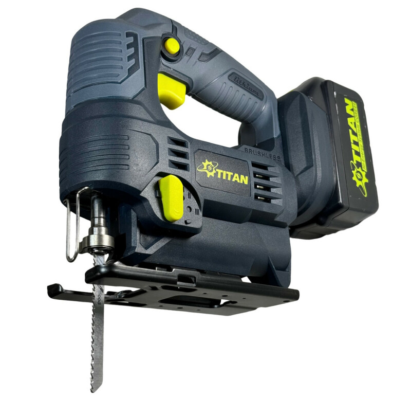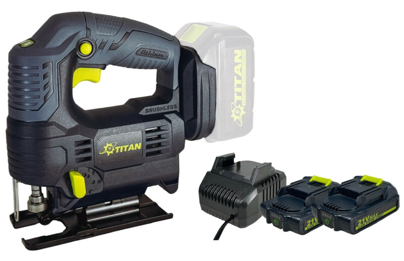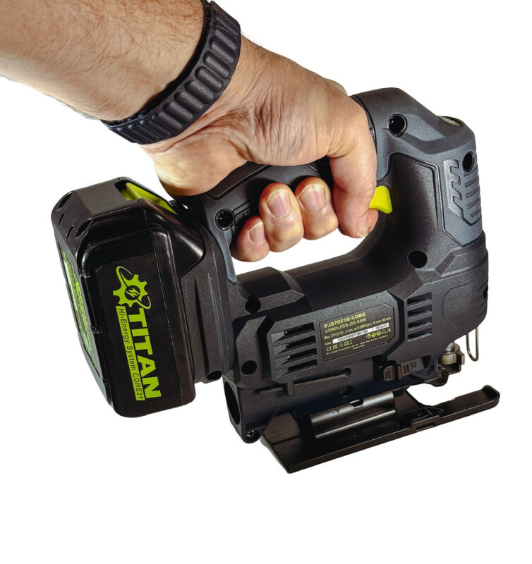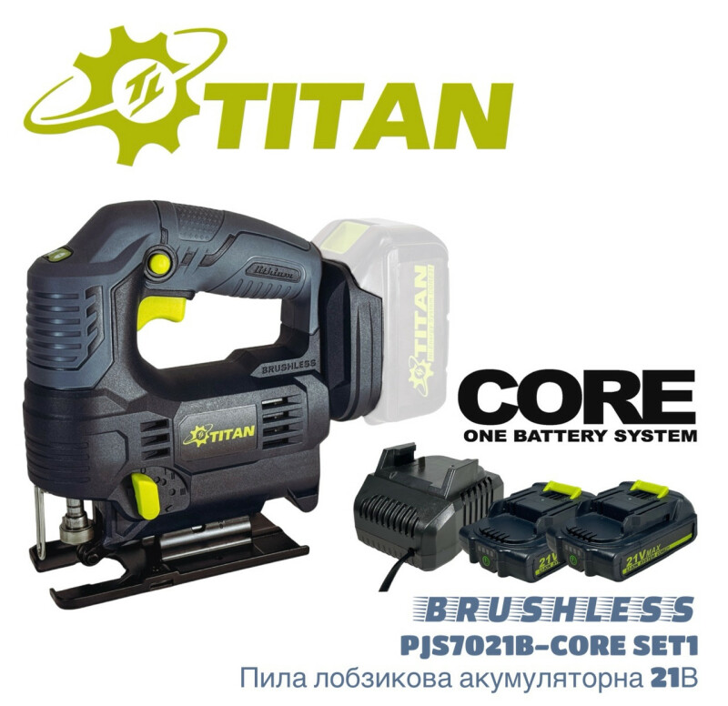 С ДВУМЯ АККУМУЛЯТОРАМИ 2ач и ЗАРЯДНЫМ УСТРОЙСТВОМ TITAN SYSTEM CORE 21 Пила лобзиковая аккумуляторная 21В, TITAN PJS7021B-CORE. Технические характеристики Бесщеточный двигатель. Питание от батарей: 18-21В. Частота ходов без погрузки: 600-2900 ход/мин. Длина рабочего хода – 15мм. Максимальная глубина реза: 80 мм. Система маятникового качения – 4 степени Длина рабочего хода – 18мм. Вес без батареи: 1,4 кг. Вес из батарей 2Ач: 1,8 кг. Преимущества ● Аккумуляторный лобзик TITAN PJS7021B-CORE совместим со всеми батареями системы TITAN CORE 21, а также с помощью системы адаптеров можно использовать батареи от 18В до 21В, почти всех производителей аккумуляторного инструмента (адаптеры поставляются опционально). ● Аккумуляторная лобзиковая пила оснащена мощным бесщеточным двигателем постоянного тока с высоким КПД, обеспечивающим большую мощность и продолжительность работы без подзарядки аккумулятора по сравнению со щеточными электродвигателями. Увеличенный срок эксплуатации без обслуживания. ● Лобзиковая пила Titan PCS6521B-CORE предназначена для резки МДФ, дерева, ПВХ. ● Светодиодная подсветка зоны резки обеспечивает улучшенную видимость рабочей поверхности, что значительно повышает точность и безопасность выполнения работ. ● Система быстрой замены лезвия без применения дополнительных инструментов. ● Аккумуляторная лобзиковая пилка имеет небольшой вес всего 1,8 кг (Вес включая батарею 2Ач), сбалансированную конструкцию, позволяющую комфортно работать длительное время. ● Эргономичный дизайн с мягкой прорезиненной ручкой, не скользит в руке и гасит вибрацию. ● Внутренняя защита от переряда батареи. ● Возможность использования аккумуляторов от 2 до 12 Ач. ● Регулировка угла резки. ● Функция обдува направляет поток воздуха в рабочую зону и обеспечивает видимость резки. При использовании пылесоса выключите эту функцию. ● Возможность подключения пылесоса. Комплектация Аккумуляторный лобзик TITAN PJS7021B-CORE - 1шт. Шестигранный ключ для смены диска – 1шт. Пильное полотно 101B – 1шт. Инструкция по эксплуатации – 1шт.