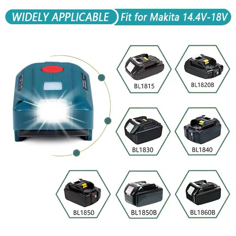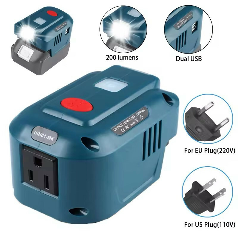 Генератор вилка США/ЕС портативный источник питания USB-адаптер со светодиодной подсветкой для Makita 18 B Описание: * Этот продукт представляет собой инвертор литиевой батареи, который может преобразовывать постоянный ток в переменный ток со стабильным выходом. * Применимые сценарии-кемпинг и выезды на улицу. * Самое сложное в походах на открытом воздухе-это зарядить небольшую бытовую технику, которую вы приносите. Этот продукт решает самую большую проблему походов. Наружная зарядка. * Двойной USB может заряжать два мобильных телефона одновременно, конструкция разъема инвертора может заряжать ваш ноутбук, бритву, фонари, небольшие вентиляторы и т. Д. Особенность: (Выходной порт постоянного тока в переменный ) Выходное напряжение этого небольшого адаптера генератора составляет 110-120 В (вилка США),220 В (вилка европейского стандарта), 150 Вт, 1.25A.com совместимая небольшая электроника, такие как сотовые телефоны, планшеты, ноутбуки, радиоприемники, небольшие вентиляторы и светодиодные фонари и т. д. от 18 до 110-120 В (вилка США),220 В (вилка ЕС), замените автомобильный инвертор питания (не применимо: несовместим с кондиционером, компрессорами и другим 不 электрооборудованием.) (Светодиодный рабочий свет) : Оснащен светодиодным рабочим фонариком на 200 лм (сн нажмите белую кнопку включения/выключения, з красную кнопку). Подходит для литиевой батареи Makita 18 В: BL1815,BL1830,BL1840,BL1850,BL1860 и т. Д. Спецификация: Номинальная мощность: 150 Вт Материал: АБС + ПК Светодиодный свет: 200 люмен Источник питания: батарея (не входит в комплект) Розетка инвертора: 150 Вт/1,25 А, 110 В/переменный ток, 220 В/переменный ток. Напряжение инвертора: для вилки европейского стандарта (220 В), для вилки американского стандарта (110 B). Особенности: выключение при низком заряде батареи, световой индикатор, защита от перегрузки. Тип: Инвертор, Портативный Пакет включает: 1 * инвертор источника питания (батарея в комплект не входит) Примечание: Изделия с электрическими вилками предназначены для вилок США/ЕС. Розетки и напряжение отличаются на международном уровне, и для этого продукта может потребоваться адаптер или преобразователь для использования в пункте назначения. Пожалуйста, проверьте совместимость перед покупкой.