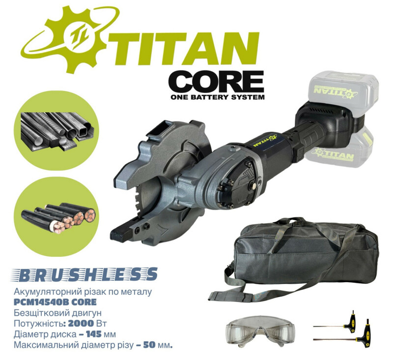 БЕЗ АККУМУЛЯТОРОВ И ЗАРЯДНОГО УСТРОЙСТВА PCM14540B-CORE Brushless Аккумуляторный резак по металлу. Технические характеристики Частота вращения на холостом ходу – 2100 об/мин. Бесщеточный двигатель – 40 В. Мощность: 2000 Вт, Диаметр диска – 145 мм. Максимальный диаметр реза – 50 мм. Диаметр посадочного места диска – 22,2 мм. Резьба шпинделя – М14. Диаметр охвата корпуса – 48 мм. Питание от батарей – 18-21 В Размер упаковки (Д х Ш х В) – 54 cm*23 cm*12.5 cm Вес без батарей и аксессуаров – 3,3 кг. Вес с 2-мя батареями 5 Ач – 4,5 .кг Преимущества ● Аккумуляторный резак TITAN PCM14540B-CORE – это современное и мощное устройство, предназначенное для быстрой и эффективной резки кабелей, арматуры и других металлических материалов. Устройство идеально подходит для профессионального применения в строительстве, энергетике, промышленности и других областях, где требуется высокая производительность и надежность. ● Высокая эффективность резки: Резак способен справляться с различными материалами, включая медные и алюминиевые кабели, арматуру и другие виды металла. Он обеспечивает чистый и ровный рез, минимизируя разрушение материала. ● Аккумуляторный резак по металлу, TITAN PCM14540B-CORE совместим со всеми батареями системы TITAN CORE 21, а также с помощью системы адаптеров, можно использовать батареи от 18В до 21В, почти всех производителей аккумуляторного инструмента MAKITA, DEWALT, BOSCH, . (адаптеры поставляются опционально). ● В аккумуляторном резаке по металлу TITAN PCM14540B-CORE установлен современный бесщеточный двигатель с высоким КПД, обеспечивающий большую мощность эквивалент 2000 Вт и продолжительность работы без подзарядки. Не требует технического обслуживания. ● Низкая себестоимость резки по сравнению с абразивными дисками, экономия до 1000%. ● В отличие от обычных отрезных станков, при использовании резака TITAN PCM14540B-CORE для резки металла практически не возникает искр, что повышает безопасность работы. ● VTC контроллер - функция плавного пуска и контроля стабильной частоты вращения без падения мощности. ● Высокий крутящий момент благодаря мощному двухступенчатому редуктору. ● Летая защита диска с упором, обеспечивает удобство при резке и надежно защищает оператора от обломков. ● Функция защиты от перегрузки гарантирует безопасную работу пользователя, в случае аварийной ситуации (внезапного замедления или остановки диска) срабатывает автоматическая остановка электромотора, для восстановления работы необходимо перезапустить инструмент. ● Защита от переразряда батареи. ● Эргономичный дизайн с прорезиненной ручкой обеспечивает надежный восторг и комфорт при использовании. ● Резак комфортно лежит в руке, обхват корпуса, всего 48 мм, позволяет длительное время работать не уставая. ● Кнопка блокировки шпинделя для легкого изменения инструмента. ● Аккумуляторный резак для кабелей и арматуры TITAN PCM14540B-CORE – это незаменимый инструмент для профессионалов, значительно ускоряющий выполнение работ и повышающий их качество. Благодаря своим выдающимся характеристикам, он становится отличным помощником в любой рабочей среде. Комплектация ● Аккумуляторный резак TITAN PCM14540B-CORE. ● Твердосплавный диск 145х1,6х22,2 мм -1шт. (установленный на инструмент) ● Дополнительная ручка -1шт. ● Ключ 2шт. ● Защитные очки -1шт. ● Инструкция. ● Сумка для транспортировки. PCM14540B-CORE.. Поставляется без зарядного устройства и без акку