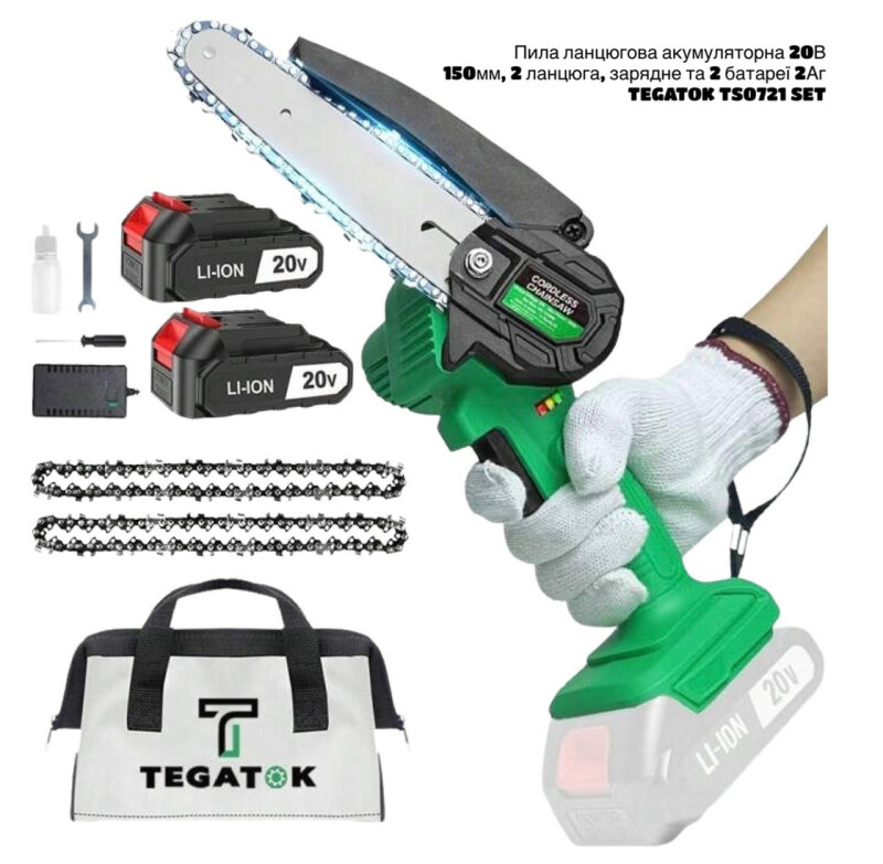 TEGATOK SYSTEM CORE 21 TS0721-CORE Аккумуляторная цепная пилка. Технические характеристики Скорость движения цепи 10 м/с. Двигатель 20В. Максимальный диаметр распила 150мм. Длина шины 150мм (макс. 200мм). Шаг цепи 1/4" Питание от батарей 18-20В. Вес без батареи – 0,75 кг. Вес из батарей 2Ач – 1,1 кг. Преимущества ● Аккумуляторная цепная пила TEGATOK TS0721-CORE совместима со всеми батареями системы TITAN CORE 21, а также с помощью системы адаптеров можно использовать батареи от 18В до 21В, почти всех производителей аккумуляторного инструмента (адаптеры поставляются опционально). Внимание!!!! Аккумуляторную цепную пилу TEGATOK TS0721-CORE, нельзя использовать с батареями Makita и Titan, без соответствующей переработки, При подключении батареи, пила сразу начинает работать, что может привести к травме!!!!! ● Аккумуляторная цепная пила оснащена мощным двигателем постоянного тока с высоким КПД, что обеспечивает большую мощность. ● Аккумуляторная цепная пила имеет малый вес, всего 1,1 кг включая батарею 2Ач, сбалансированная конструкция позволяет комфортно работать одной рукой. ● Выключатель с блокировкой от случайного пуска, для комфорта и безопасности пользователя. ● Защита от переразряда батареи. ● Возможность использования аккумуляторов от 2 до 12 Ач. Комплектация ● Аккумуляторная цепная пила TEGATOK TS0721-CORE - 1шт. ● Направляющая шина 150мм – 1шт. ● Цепь 150мм - 2шт. ● Тюбик для смазки – 1шт. ● Отвертка – 1шт. ● Сумка.