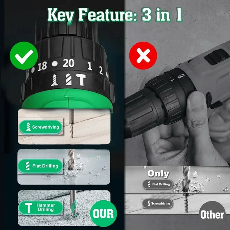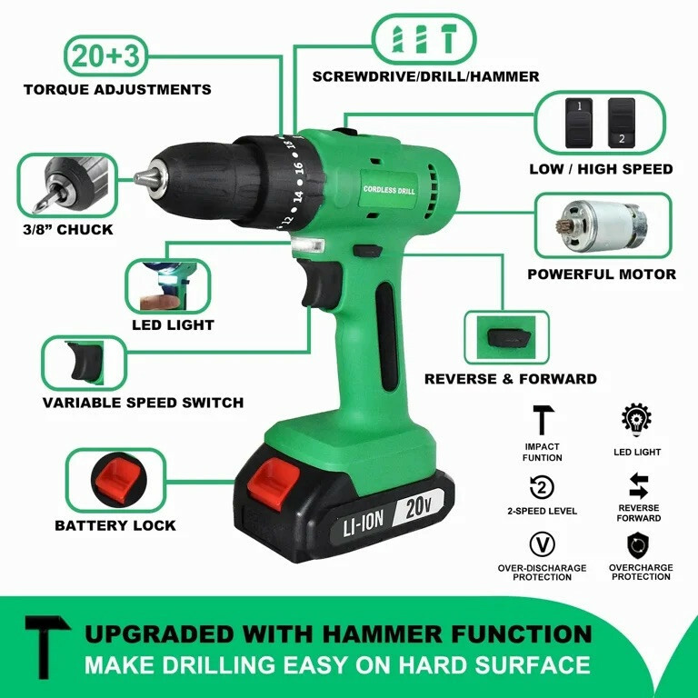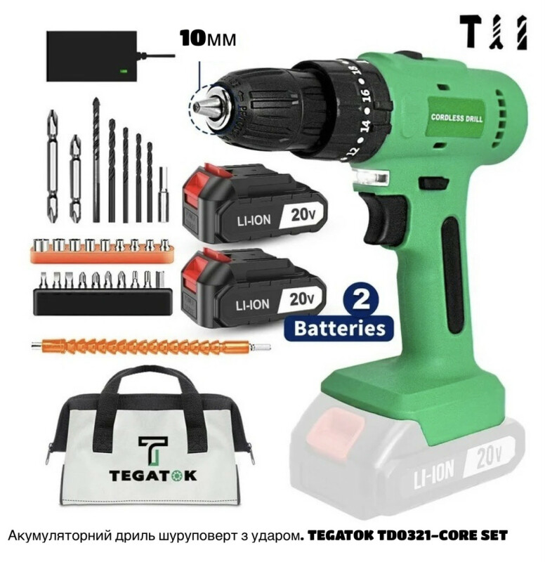 TEGATOK SYSTEM CORE 21 TD0321-CORE Аккумуляторная дрель шуруповерта с ударом. Технические характеристики Частота вращения на холостом ходу – 0-400/0-1400 об/мин. Максимальный крутящий момент – 42 Нм. Самозажимной патрон – 1-10 мм. Диаметр сверления сталь – 10 мм. Диаметр сверления дерева – 22 мм. Число ступеней регулировки предельного момента затяжки – 21+1. Питание от батарей – 18-21В Вес из батарей 2Ач – 1,1 кг. Преимущества ● Аккумуляторный шуруповерт TEGATOK TD0321-CORE совместим со всеми батареями системы TITAN CORE 21, а также с помощью системы адаптеров можно использовать батареи почти всех производителей аккумуляторного инструмента (адаптеры поставляются опционально). ● 2х скоростной редуктор позволяет выбрать оптимальную скорость работы в зависимости от материала и поставленной задачи. ● Функция сверления с ударом. ● Защита от переразряда батареи. ● 21+1 положение муфты регулировки крутящего момента для аккуратного закручивания. ● LED Подсветка встроена в ручку, прекрасно осветит зону работы. Комплектация Шуруповерт TD0321-CORE Сумка для транспортировки 1шт. Набор аксессуаров 28 Набор сверл 1шт, (5 сверл) Инструкции.