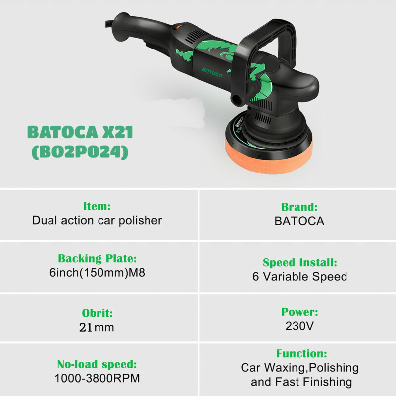 BATOCA Professional Detailing Полировальная машина BATOCA X21 (B02PO24) Технические характеристики Мощность двигателя – 700 Вт. Напряжение – 230 В/50 Гц. Частота вращения без погрузки – 1000-3800 об/мин. Диаметр подошвы – 125 мм. (макс. 150 мм). Ход эксцентрика - 21 мм. Резьба шпинделя – М8 Вес без кабеля питания – 2,2 кг. Преимущества ● Ротационно-эксцентриковая полировальная машина BATOCA X21 (B02PO24) относится к профессиональной серии. ● В отличие от традиционных ротационных полировальных машин, ротационно-эксцентриковая полировальная машина BATOCA X21 (B02PO24), позволяет работать на больших оборотах не оставляя при этом голограмм и не перегревая полированную поверхность, это дает возможность значительно увеличить производительность. ● Для обеспечения стабильной работы инструмента под нагрузкой он оснащен системой охлаждения двигателя и редуктора. Поток отходящего воздуха не мешает пользователю. ● VTC контроллер - функция плавного пуска и контроля стабильной частоты вращения без падения мощности. ● Функция защиты от непреднамеренного запуска. ● Высокая плавность хода и низкая вибрация достигается благодаря точному сбалансированному противовесу. ● Специальный демпфированный тарельчатый круг с креплением шлифовальных средств на "липучке" для полировки. ● Небольшой вес всего 2,2 кг позволяет долго и комфортно работать. ● Профессиональный неопреновый питающий кабель длиной 8 м, не оставляет следов на лакокрасочном покрытии и обеспечивает оптимальный радиус действия. ● Эргономичный дизайн с оптимальной для хвата формой рукояток для комфортной работы. ● Благодаря плоской форме головки редуктора расстояние до поверхности сокращается, что позволяет уверенно управлять устройством в любом положении. Вывод Полировальная машина BATOCA X21 – это надежный помощник в мире полировки и ухода за транспортными средствами. С ее помощью вы сможете добиться профессиональных результатов, не выходя из собственного гаража. Не упустите возможность сделать ваш автомобиль безупречным! Комплектация ● Полировальная машина BATOCA X21 (B02PO24) - 1шт. ● Подошва 125 мм – 1 шт. ● Полировальная губка 125 мм – 1 шт. ● Боковая ручка – 1 шт. ● D-образная ручка – 1 шт. ● Угольные щетки – 1 шт. ● Ключ – 1шт. ● Сумка для переноски и хранения - 1шт. ● Инструкция по эксплуатации – 1шт.