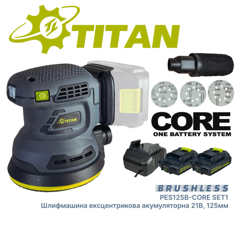 В КОМПЛЕКТЕ 2 АККУМУЛЯТОРА 2ач+ЗАРЯДНОЕ УСТРОЙСТВО PES125B-CORE Brushless Аккумуляторная эксцентриковая шлифмашина. Технические характеристики Частота вращения на холостом ходу - 7000/8000/11000 об/мин. Бесщеточный двигатель - 21В. Диаметр подошвы - 125мм. Крепление наждачной бумаги - липучка. Питание от батарей - 18-21В Вес без батарей и аксессуаров - 1,6кг. Вес с батарей 2Ач - 2,2.кг Преимущества ● Аккумуляторная эксцентриковая шлифмашина TITAN PES125B-CORE совместима со всеми батареями системы TITAN CORE 21, а так же с помощью системы адаптеров, можно использовать батареи от 18В до 21В, почти всех производителей аккумуляторного инструмента (адаптеры поставляются опционно). ● В аккумуляторной болгарке TITAN PAG621B-CORE установлен современный бесщеточный двигатель с высоким КПД, обеспечивающий большую мощность и продолжительность работы без подзарядки. Не требует технического обслуживания. ● Intelligent Control System - Смарт система выбора скорости и контроля стабильной частоты вращения, без падения мощности, с сенсорным управлением. ● Всторенная защита от переразряда батареи. ● Эргономичный дизайн с мягкой прорезиненной ручкой обеспечивает уверенный хват и снижает вибрацию. ● Для удаления пыли при использовании шлифмашину можно подключить к пылесосу или воспользоваться удобным мешком, входящим в комплект. Комплектация ● Эксцентриковая шлифмашина TITAN PES125B-CORE. ● Шлифовальный бумага 125мм -3шт. ● Мешок для сбора пыли -1шт. ● Инструкция. ● Картонная упаковка. 2 АККУМУЛЯТОРА ПО 2ач и ЗАРЯДНОЕ УСТРОЙСТВО