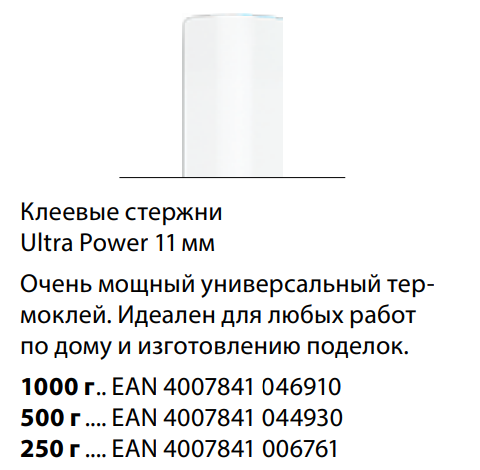 Стержень клеевой ультра мощный (10 шт.) STEINEL 006761 - это сменный элемент, использующийся совместно с клеевыми пистолетами. Предназначен для соединений высокой прочности. Является универсальным и пригоден для различных материалов: бумаги, войлока, древесины, стекла. В наборе 10 шт. Ø 11 мм Характеристики цвет прозрачные количество в упаковке, шт 10 вес, гр. 250