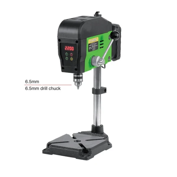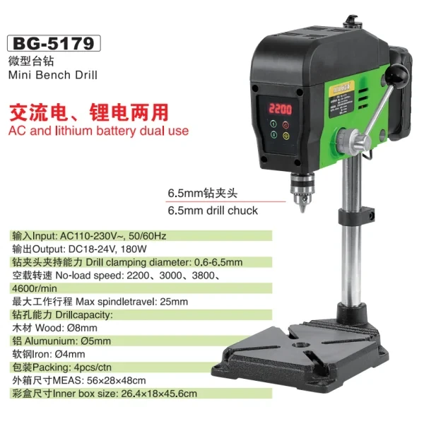 СОВМЕСТИМ С АККУМУЛЯТОРАМИ МАКИТА 18В.TITAN-CORE 21V.PROFI-TEC 20V Beking BG-5179 настольный сверлильный станок с кулачковым патроном, используется для сверления металлов, пластиков, древесины, керамики, полимерных смол, композитных панелей. Сверлильный станок предназначен для использования как в домашних, так и в профессиональных условиях. Отличительной особенностью данной модели являются его размеры и вес. Вес станка составляет всего 6 кг, что делает его компактным и удобным в использовании, поэтому расположить его в любом месте не составит труда. Мини-станок Beking BG-5179 оснащен гибридным бесщеточным двигателем с рабочим напряжением 220 В и 21 В, что является особенностью данного инструмента и позволяет работать как от бытовой сети, так и от аккумулятора. Бесщеточный двигатель не требует обслуживания и обладает высоким КПД. Данный станок выполнен из высококачественных материалов. Установленный двигатель имеет мощность 180 Вт, что покажет высокую производительность в работе. Хорошая система вентиляции не даст инструменту сильно перегреваться. Интуитивно понятное управление станком позволяет быстро и легко выбрать нужную скорость и без проблем выполнять различные виды работ. С плавным ходом шпинделя 60 мм и максимальными оборотами до 4600 об/мин, можно выполнять сверление с высокой точностью. Само оборудование не имеет люфтов, что будет являться огромным преимуществом при выполнении точных работ. Выполнять отверстия можно в разных видах материалов. Цифровой дисплей с сенсорными кнопками для регулировки количества оборотов поможет вам подобрать необходимую частоту для определенного материала. Плавный ход ручки сделает работу максимально осторожной. Надежные зажимы закрепят инструмент на нужной высоте. Подошва стола имеет специальные отверстия, чтобы надежно закрепить конструкцию на рабочей поверхности. Есть также отверстия для установки координатного стола или тисков. Установленный глубиномер поможет не только проследить за глубиной сверления, но и позволит установить максимальную глубину сверления. Благодаря широкому диапазону зажима сверл от 0.6 до 6.5 мм, он подходит для работы с разными типами сверл. При отсутствии доступа к проводной сети питания (блекаут, авария, выездные работы) - станок можно использовать в автономном режиме с питанием от аккумулятора. Для питания инструмента используют любой аккумулятор типоразмера Makita LXT или с совместимой линейки аккумуляторов Titan Core system, Sakuma, Prokraft, Grand PRO и др. Наилучшая производительность и максимальная продолжительность автономной работы, достигается при использовании мощных аккумуляторов емкостью 4, 5 или 9 Ач. 18-21V. Характеристика: Тип - настольный сверлильный станок MINI BENCH DRILL с гибридным питанием Тип питания - гибридный (AC/DC) Dual Power Источник питания - обычная бытовая сеть 220 В ~50 Гц или подключаемая аккумуляторная батарея 18-21V Питание от аккумулятора: АКБ 18-21V (типоразмер Makita) Тип двигателя - бесщеточный (brushless) Потребляемая мощность 180 Вт Количество режимов скоростей - 4 Число оборотов шпинделя 0 - 2200 / 3000 / 3800 / 4600 об/мин. Регулировка скорости - переключение режимов сенсорными кнопками +/- Реверс - есть, переключение направления сенсорной кнопкой Патрон сверлильного станка - зубчато-венцовый (кулачковый) Ход шпинделя 25 мм. Крепление патрона - конус Морзе B 12 Диаметр зажимаемых сверл 0.6 - 6.5 мм. Рекомендов