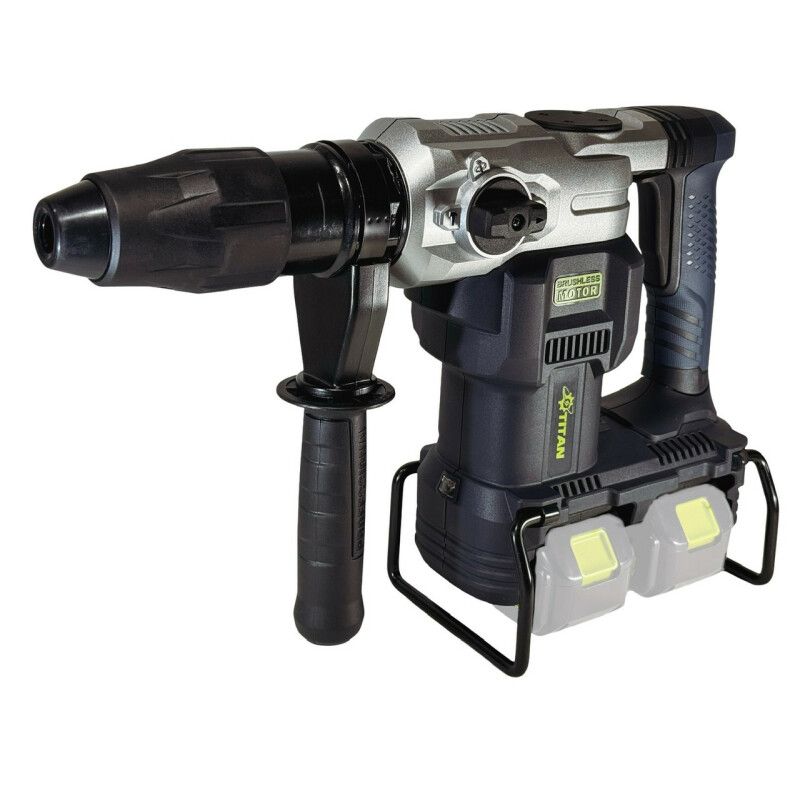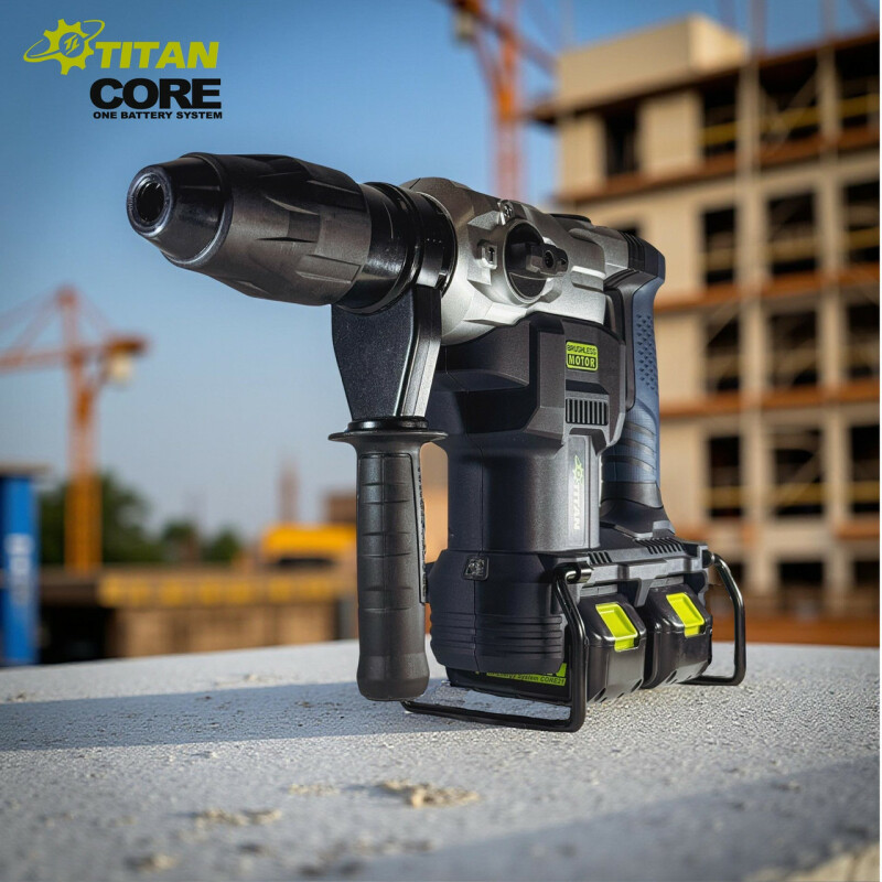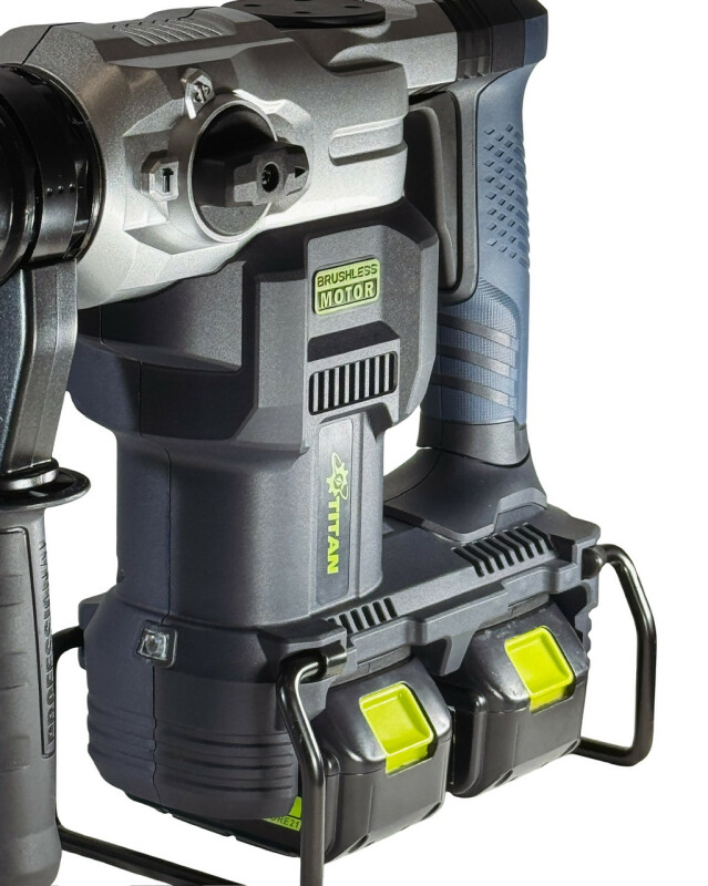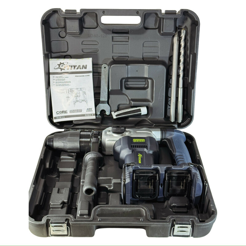 TITAN SYSTEM CORE 21 PRH3840B-CORE Аккумуляторный перфоратор Технические характеристики Частота вращения на холостом ходу: 250-600 об/мин. Частота ударов на холостом ходу: 1300-3600 уд/мин. Бесщеточный двигатель: 42В. Максимальная энергия удара: 11,6 Дж. Тип патрона: SDS-MAX Диаметр сверления бетона: 40 мм. Диаметр сверления сталь: 13 мм. Диаметр сверления: 50 мм. Питание от батарей: 21В x 2 (42 В) Вес без батарей и аксессуаров: 6,5кг. Вес с двумя батареями 5Ач: 7,7.кг Преимущества Аккумуляторный перфоратор PRH3840B-CORE совместим со всеми батареями системы TITAN CORE 21, а также с помощью системы адаптеров можно использовать батареи от 18В до 21В, почти всех производителей аккумуляторного инструмента (адаптеры поставляются опционально). Бесщеточный двигатель постоянного тока с высоким КПД обеспечивает большую мощность и продолжительность работы без подзарядки аккумулятора. Не требует технического обслуживания. Перфоратор TITAN PRH3840B-CORE имеет 2 режима работы: только удар (идеально подходит для бетона и кирпича), сверление с ударом (подходит для тяжелых работ) + режим изменения угла долота. Регулируемая на 360° рукоятка обеспечивает комфорт, снижает утомляемость и улучшает контроль. Универсальный патрон SDS-Max имеет высокую удерживающую способность и надежность с возможностью быстрой замены оснастки. Высококачественный ударный механизм обеспечивает хорошую производительность и большой ресурс инструмента. Расцепляющая муфта, предохраняющая инструмент при заклинивании бура. Функция контроля скорости обеспечивает постоянную скорость вращения независимо от условий нагрузки. Технология активного контроля обратной связи Если инструмент вращается с заданным ускорением во время работы, двигатель принудительно останавливается, чтобы уменьшить нагрузку на запястья. Защита от переразряда батареи. LED Подсветка, прекрасно осветит зону работы. Эргономичный дизайн с мягкой прорезиненной ручкой, не скользит в руке и гасит вибрацию. Удобный прочный чемодан для транспортировки и хранения. Комплектация Аккумуляторный перфоратор TITAN PRH3840B-CORE-1шт. Пластиковый чемодан.-1шт. Пика SDS-MAX 320 мм - 1шт. Сверло SDS-MAX по бетону 18x320 -1шт. Тюбик для смазки бура -1шт. Ключ - 1 шт Боковая упорная рукоятка.-1шт Инструкция.-1шт. Поставляется без зарядного устройства и без аккумулятора.