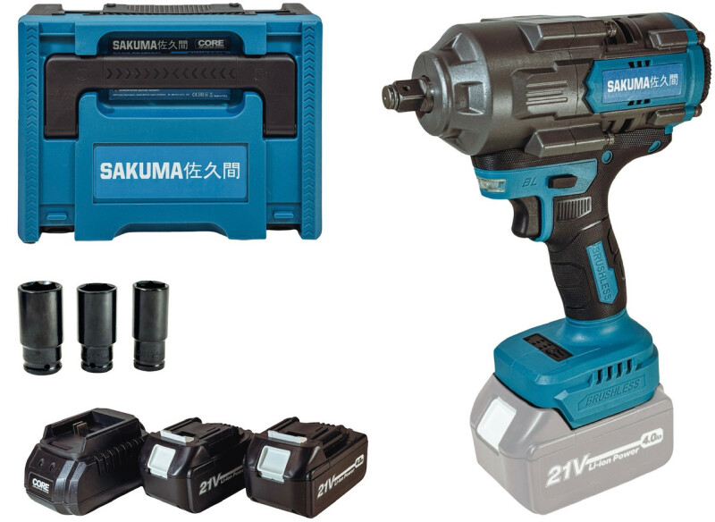 SAKUMA SYSTEM CORE 21 CIW10021B-CORE Brushless аккумуляторный ударный гайковерт. Технические характеристики Частота вращения на холостом ходу: 0-1300/2200/3000 об/мин. Частота ударов: 0-3000 уд/мин Бесщеточный двигатель: 21В. Максимальный крутящий момент: 1000 Нм. Крепление оснастки: квадрат 1/2». Питание от батарей: 18-21В Вес без батареи: 2,0 кг. Вес с батареями 4Ач: 2,4 кг. Преимущества ● Аккумуляторный ударный гайковерт SAKUMA BLUE CIW10021B-CORE, совместимый со всеми батареями системы SAKUMA CORE 21, а также с помощью системы адаптеров можно использовать батареи почти всех производителей аккумуляторного инструмента (адаптеры поставляются опционально). ● Intelligent Control System - Смарт система выбора и контроля работы с сенсорным управлением и светодиодной индикацией. ● Широкий диапазон выбора скорости 0-1300/2200/3000 об/мин. ● Высокий крутящий момент зажима 1000 Нм позволяет справляться с тяжелыми работами по затягиванию и сверлению. ● В гайковерте CIW10021B-CORE установлен современный бесщеточный двигатель с высоким КПД, обеспечивающий большую мощность и продолжительность работы без подзарядки. Не требует технического обслуживания. ● Прочный металлический корпус редуктора, обеспечивающий высокий ресурс инструмента. ● Защита от переразряда батареи. ● Электронный тормоз облегчает выполнение серийных задач с высокой точностью. ● LED Подсветка встроена в ручку, прекрасно освещает зону работы. ● Эргономичный дизайн с мягкой прорезиненной ручкой, не скользит в руке и гасит вибрацию. Комплектация Гайковерты SAKUMA BLUE CIW10021B-CORE: 1 шт. Пластиковый чемодан: 1 шт. Ударная головка М21: 1 шт. Ударная головка М24: 1 шт. Ударная головка М30: 1 шт. Инструкции. CIW10021B-CORE SET02. Поставляется с 2 батареями 4Ач. и зарядным устройством.