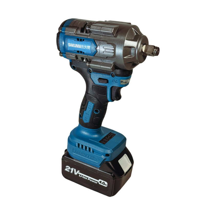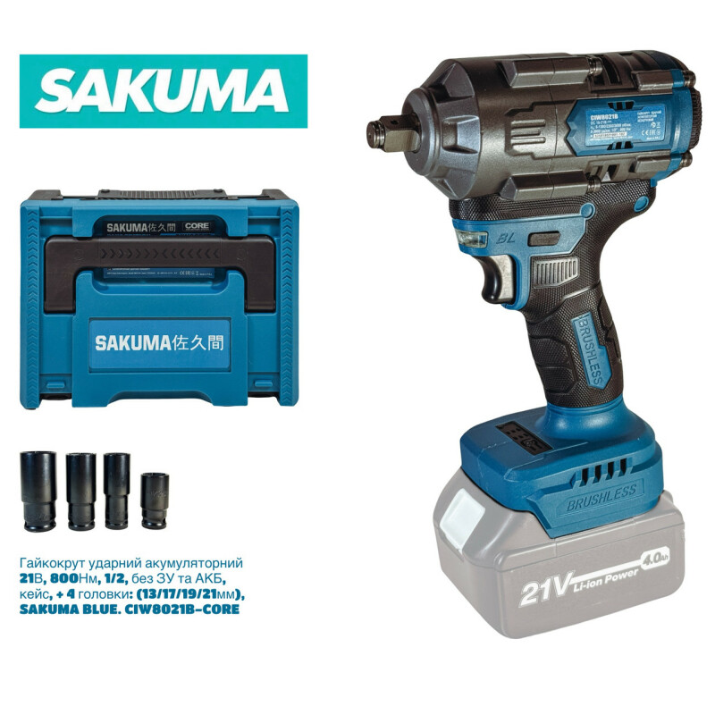 SAKUMA SYSTEM CORE 21 CIW8021B-CORE Brushless аккумуляторный ударный гайковерт. Технические характеристики Частота вращения на холостом ходу: 0-1300/2200/3000 об/мин. Частота ударов: 0-3000 уд/мин Бесщеточный двигатель: 21В. Максимальный крутящий момент: 800 Нм. Крепление оснастки: квадрат 1/2". Питание от батарей: 18-21В Вес без батареи: 1,6 кг. Вес с батареями 4Ач: 2,0 кг. Преимущества ● Аккумуляторный ударный гайковерт SAKUMA BLUE CIW8021B-CORE, совместимый со всеми батареями системы SAKUMA CORE 21, а также с помощью системы адаптеров можно использовать батареи почти всех производителей аккумуляторного инструмента (адаптеры поставляются опционально). ● Intelligent Control System - Смарт система выбора и контроля работы с сенсорным управлением и светодиодной индикацией. ● Широкий диапазон выбора скорости 0-1300/2200/3000 об/мин. ● Высокий крутящий момент зажима 800 Нм позволяет справляться с тяжелыми работами по затягиванию и сверлению. ● В гайковерте CIW8021B-CORE установлен современный бесщеточный двигатель с высоким КПД, обеспечивающий большую мощность и продолжительность работы без подзарядки. Не требует технического обслуживания. ● Прочный металлический корпус редуктора, обеспечивающий высокий ресурс инструмента. ● Защита от переразряда батареи. ● Электронный тормоз облегчает выполнение серийных задач с высокой точностью. ● LED Подсветка встроена в ручку, прекрасно освещает зону работы. ● Эргономичный дизайн с мягкой прорезиненной ручкой, не скользит в руке и гасит вибрацию. Комплектация Гайковерты SAKUMA BLUE CIW8021B-CORE: 1 шт. Пластиковый чемодан: 1 шт. Ударная головка М13: 1 шт. Ударная головка М17: 1 шт. Ударная головка М19: 1 шт. Ударная головка М21: 1 шт. Инструкции. CIW8021B-CORE. Поставляется без зарядного устройства и без аккумулятора.