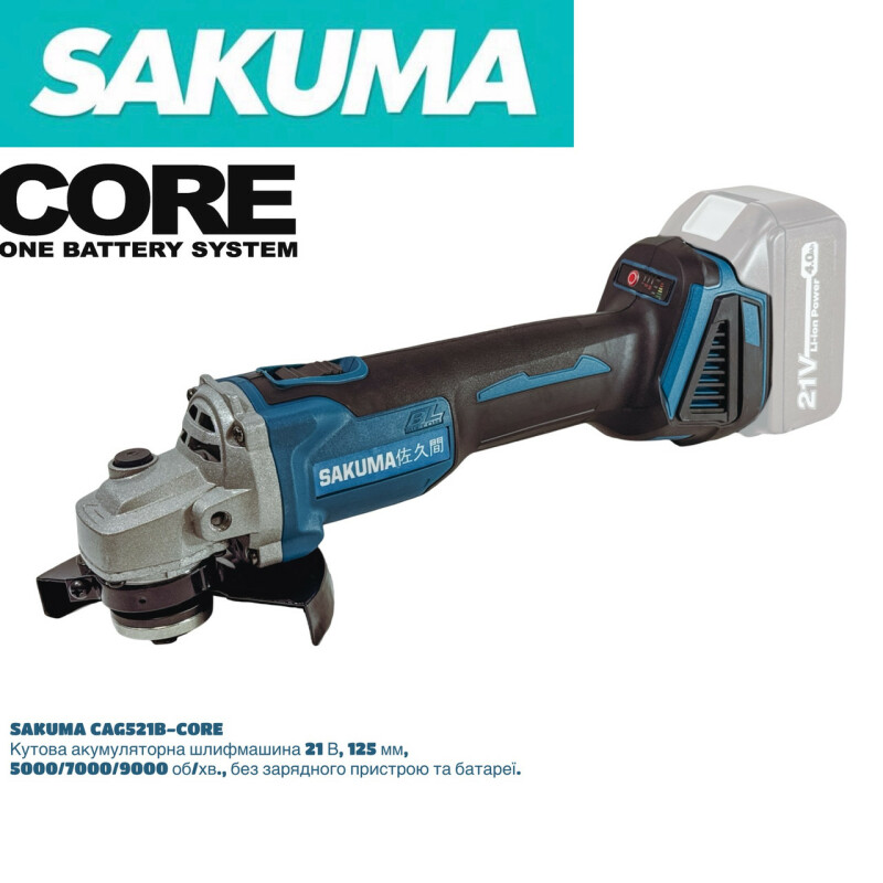 SAKUMA BLUE SYSTEM CORE 21 CAG521B-CORE Brushless Аккумуляторная угловая шлифмашина. Технические характеристики Частота вращения на холостом ходу – 5000/7000/9000 об/мин. Бесщеточный двигатель – 21В. Диаметр диска – 125мм. Диаметр посадочного места диска – 22,2мм. Резьба шпинделя – М14. Обхват корпуса – 47мм. Питание от батарей – 18-21В Размеры (Д х Ш х В) – 362 x 140 x 145 мм Вес без батарей и аксессуаров – 1,5кг. Вес из батарей 4Ач – 2,0.кг Преимущества ● Аккумуляторная угловая шлифмашина CAG521B-CORE совместима со всеми батареями системы SAKUMA BLUE CORE 21, а также с помощью системы адаптеров, можно использовать батареи от 18В до 21В, почти всех производителей аккумуляторного инструмента (адаптеры поставляются опционально). ● В аккумуляторной болгарке SAKUMA BLUE CAG521B-CORE установлен современный бесщеточный двигатель с высоким КПД, обеспечивающий большую мощность и длительность работы без подзарядки. Не требует технического обслуживания. ● Intelligent Control System - Смарт-система выбора скорости с сенсорным управлением и светодиодной индикацией. ● Защита от переразряда батареи. ● Эргономичный дизайн с мягкой прорезиненной ручкой, не скользит в руке и гасит вибрацию. ● Болгарка комфортно лежит в руке, обхват корпуса, всего 47мм, позволяет длительное время работать не уставая. ● Кнопка блокировки шпинделя для легкого изменения инструмента. Комплектация ● Угловая шлифмашина SAKUMA BLUE CAG521B-CORE. ● Защита 125мм -1шт. ● Дополнительная ручка -1шт. ● Ключ 1шт. ● Гайка М14 -1шт. ● Фланец 22,2 мм -1шт. ● Инструкция. ● Пластиковый чемодан. CAG521B-CORE. Поставляется без зарядного устройства и аккумулятора.