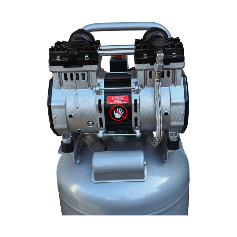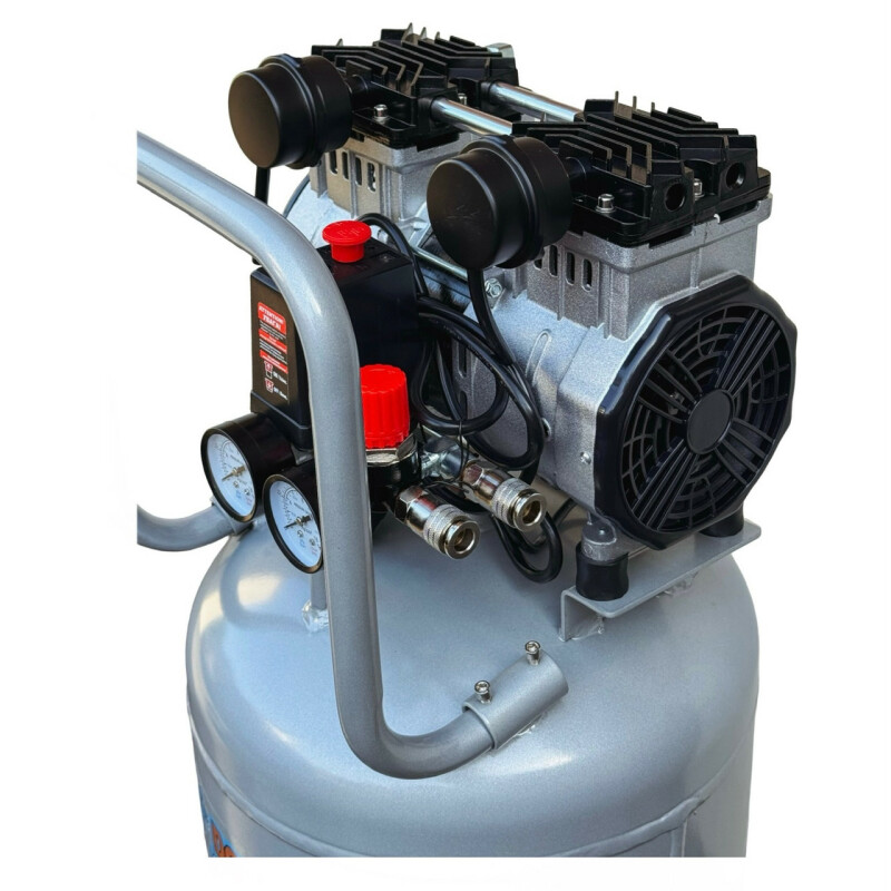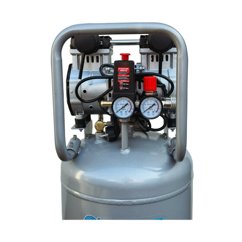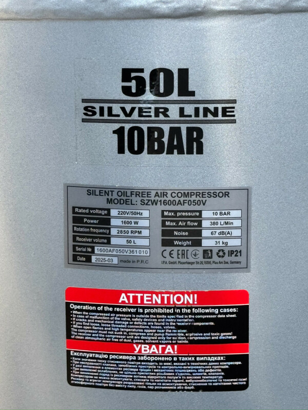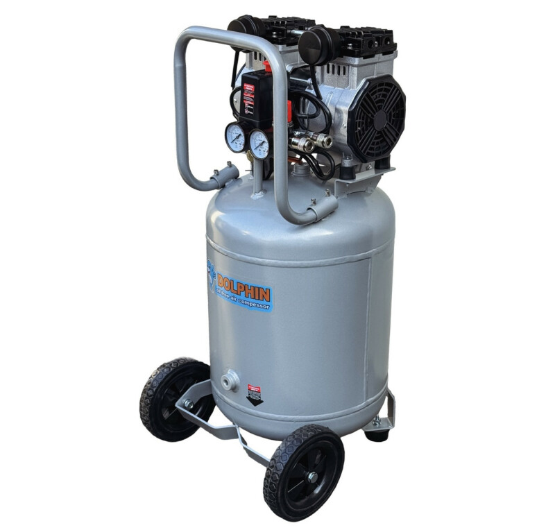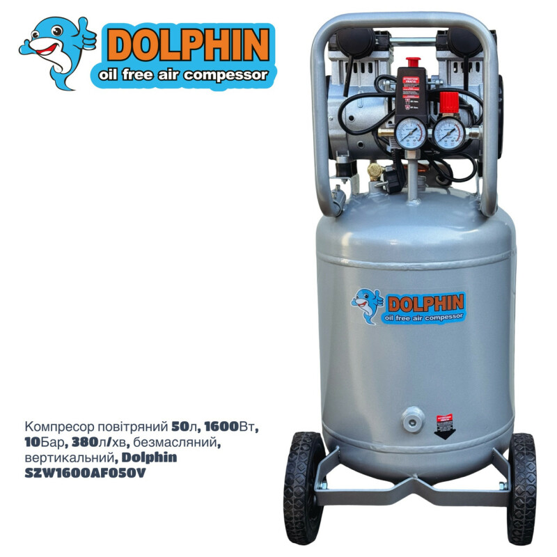 Dolphin Silver Line. Бесшумный, без масляный компрессор Dolphin SZW1600AF050V Технические характеристики Мощность - 1,6кВт. Напряжение питающей сети: 220В/50Гц. Рабочее давление. 0-10Бар. Объем ресивера. 50л. Тип ресивера: вертильный. Производительность на входе. 380 л/мин. Производительность на выходе. 235 л/мин. Диаметр поршня. 69.7мм. Количество поршней. 2. Ход поршня. 22-мм. Частота вращения. 1400 об/мин. Диаметр резьбового соединения для фильтра. Уровень шума. 67дБ. Класс защиты - IP21. Вес компрессора. 31кг. Габаритные размеры компрессора 855мм*370мм*385мм. Длина кабеля. 1.3м. Преимущества ● Без масляный компрессор «сухого сжатия» Dolphin SZW1600AF050V, в отличие от маслонаполненного, обеспечивает выработку жатого воздуха очень высокой степени чистоты, в нем не содержится песок и твердые частицы грязи, пыль и масляные пары, благодаря данной особенности компрессор – востребован там, где предъявляются высокие требования к качеству воздуха -для чувствительного и высокотехнологичного оборудования, в медицинской, пищевой и электронной промышленности. ● Очень низкий уровень шума всего 67дБ, можно использовать компрессор в помещений. ● Цилиндры компрессорного блока с тефлоновым покрытием, самосмазывающиеся поршневые кольца изготовлены из фторопластовых композитных материалов с очень низким коэффициентом трения, что позволяет не проводить дополнительного обслуживания и продлевают срок эксплуатации. ● Подшипники качения электродвигателя и шейки коленчатого вала выполнены закрытыми и не требуют ухода при эксплуатации. ● Электродвигатель имеет тепловую защиту. ● Медная обмотка двигателя дает такие преимущества. Повышенный ресурс работы. Не особо перегревается в момент больших нагрузок. Высокая прочность. Ускоренное охлаждение. ● Ресивер изнутри покрыт эпоксидным покрытием. Есть кран для слития конденсата. ● В основе создания бесшумного без масляного компрессора Dolphin SZW1600AF050V, лежат принципиально новая конструкция поршневого блока, которая с одной стороны позволяют сохранить достаточную для работы производительность, но при этом снижают уровень шума при работе компрессора. ● Компрессор выполнен в профессиональном компактном исполнении, имеет два цилиндра c электродвигателем, установленных на ресивере. Все детали компрессора изготовлены в соответствии с международными стандартами DIN и ISO, что обеспечивает их полную взаимозаменяемость при ремонте, прост и удобен в эксплуатации. ● Компрессорный блок закреплен на ресивере на шпильках с резиновыми вставками, это значительно снижает вибрацию и шум. ● В комплекте воздушный фильтр со сменным элементом в металлическом корпусе, более прочный в отличии от хрупких пластиковых аналогов. ● Небольшой вес, компактные габаритные размеры. Комплектация ● Компрессор Dolphin SZW1600AF050V 1шт. ● Воздушный фильтр в металлическом корпусе 2шт. ● Инструкция по эксплуатации. ● В комплекте колеса транспортировочные 2шт. ● В комплекте виброгасящие опоры с резьбой 2шт. ● Воздух на выходе остается чистым, так как компрессор не использует смазочные материалы