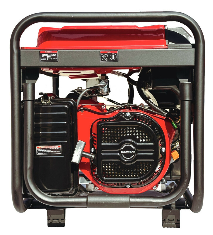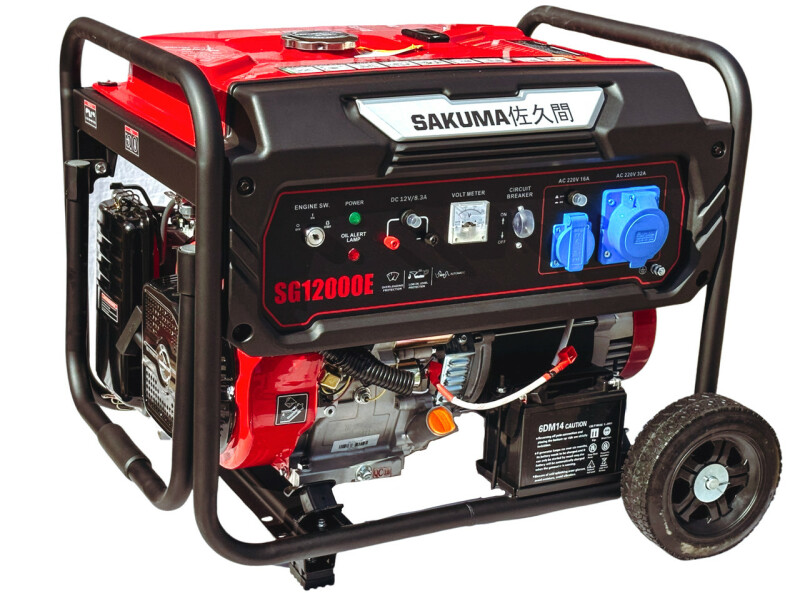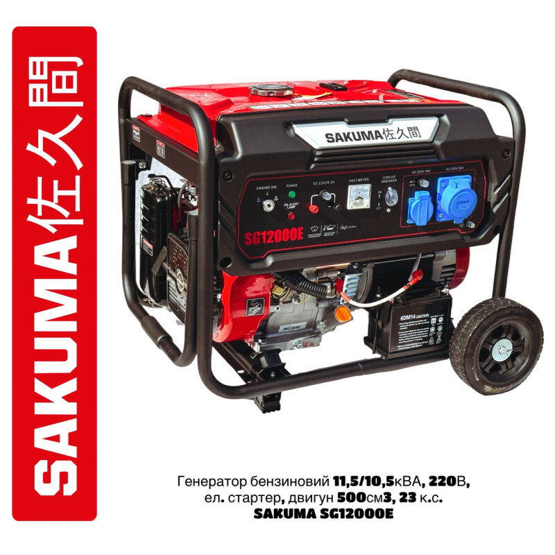 Бензиновый генератор SAKUMA SG12000E. Технические характеристики Частота переменного тока: 50 Гц. Напряжение переменного тока: 220 В. Пиковая мощность: 11,5 кВА (10 кВт). Номинальная мощность: 10,5 кВА (9 кВт). Система запуска: ручная/электро. Емкость топливного бака: 25,0 л. Показатель уровня топлива: есть. Общий удельный расход топлива: 0,35 л/кВт. Розетка постоянного тока: 12 В/8,3 А. Розетка переменного тока: 220 В/16 А. Розетка переменного тока: 220 В/32 А. Вольтметр: есть. Уровень шума при нагрузке 50% на расстоянии 7 м: 70дБ(А): Модель двигателя: SG500F. Мощность двигателя: 20,5 л.с. Рабочий объем двигателя: 500 куб. Тип двигателя: 4-тактный, с верхним расположением клапанов. Система воспаления: транзисторная. Система охлаждения: принудительная воздушная. Емкость масла: 1,2л. Габариты: 710х650х785мм. Вес: 105/110кг. Гарантия: 12мес. Страна регистрации бренда: Япония. Преимущества ● SAKUMA SG12000E – бензиновый генератор, оснащенный автоматическим регулятором напряжения (АVR), обеспечивающий надежное и стабильное напряжение 220 вольт. Это позволяет использовать чувствительные и высокоточные электронные устройства. ● Для удобства пользователя, генератор SAKUMA SG12000E оснащен электро стартером, так же это позволяет подключать автоматику. ● Ротор и статор имеет 100% медную обмотку, что позволяет использовать генератор длительное время при максимальных нагрузках. ● Датчик низкого уровня масла с индикацией. ● Датчик перегрузки. ● Продолжительность работы, до 12 часов без перерыва, доступна благодаря воздушному охлаждению двигателя. ● На передней панели есть клеммы 12В постоянного тока, они предназначены для зарядки АКБ автомобилей. (Запрещается одновременно использовать клеммы 12В и розетку 220В). ● Для удобства перемещения комплектуется набором для транспортировки, который включает: резиновые колеса, стояночные опоры и складную рукоятку. Колеса из цельнолитой резины со стальной основой, не требуют накачки и устойчивы к проколам. Комплектация ● SG12000E бензиновый генератор. ● Свечной ключ – 1шт. ● Воронка для масла - 1шт. ● Аккумуляторная батарея 12В – 1шт. ● Комплект колес - 2шт. ● Инструкция по эксплуатации – 1шт.