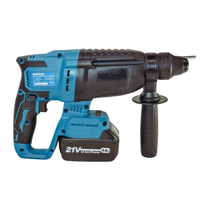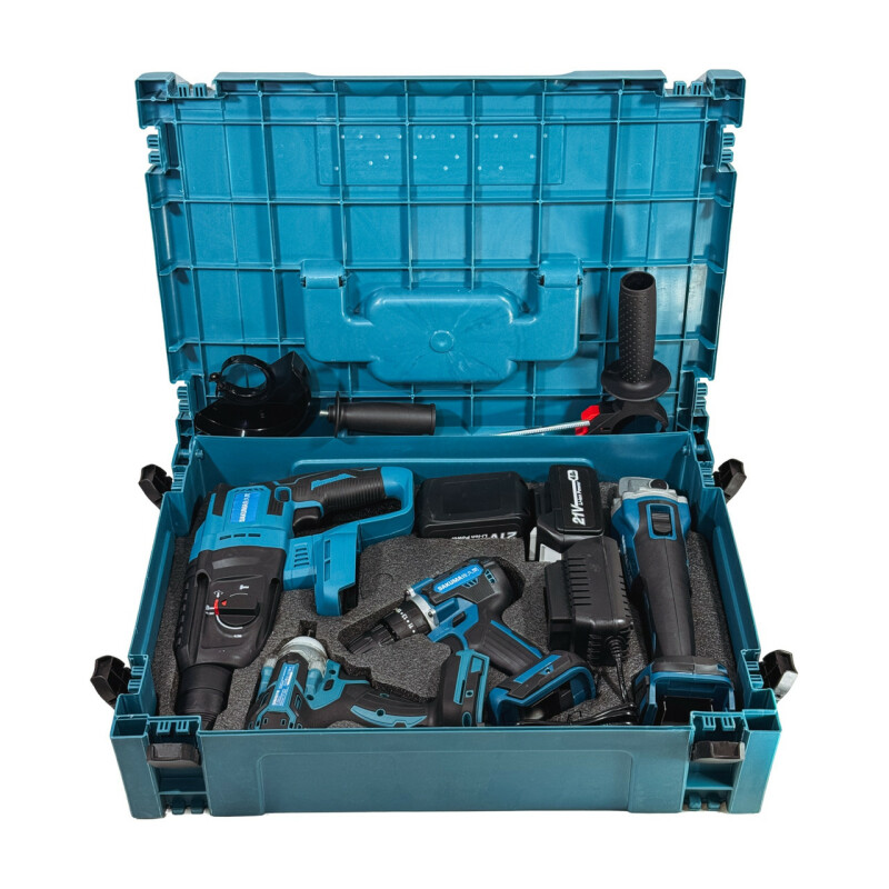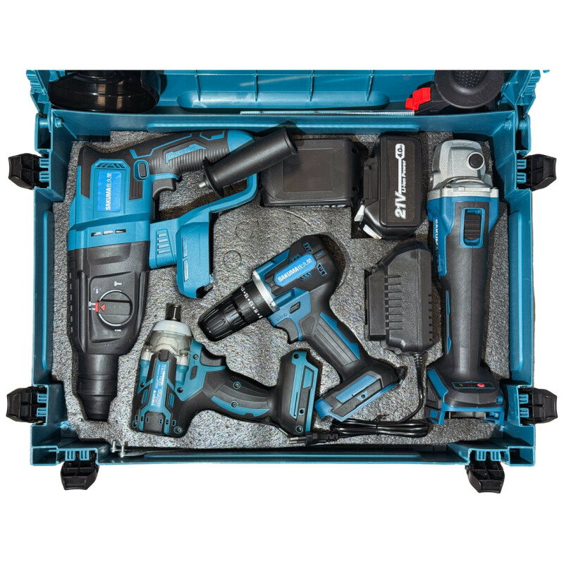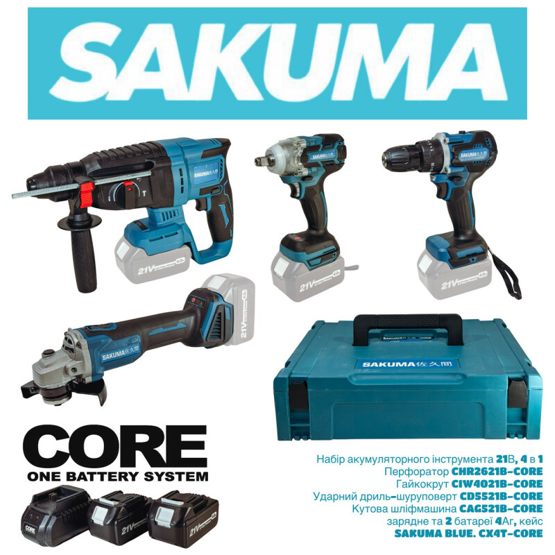 SAKUMA SYSTEM CORE 21 Набор аккумуляторного инструмента 21В, перфоратор, гайкокрут, дрель-шуруповерт и угловая шлифмашина, SAKUMA BLUE. CX4T-CORE (CD5521B, CAG521B, CHR2621B, CIW4021B) Технические характеристики 1. Аккумуляторная ударная дрель шуруповерта CD5521B-CORE Brushless. Частота вращения на холостом ходу: 0-400/0-1400 об/мин. Бесщеточный двигатель: 21В. Максимальный крутящий момент: 55 Нм. Самозажимной патрон: 1-10 мм. Диаметр сверления сталь: 10 мм. Диаметр сверления: 22 мм. Число ступеней регулировки предельного момента затяжки: 21+1. Ударная функция: есть. Питание от батарей: 18-21В Вес из батарей 2Ач: 1,2 кг 2. Аккумуляторная угловая шлифмашина CAG521B-CORE Brushless. Частота вращения на холостом ходу: 5000/7000/9000 об/мин. Бесщеточный двигатель: 21В. Диаметр диска: 125 мм. Диаметр посадочного места диска: 22,2 мм. Резьба шпинделя: М14. Обхват корпуса: 47мм. Питание от батарей: 18-21В Размеры (Д х Ш х В): 362 x 140 x 145 мм Вес без батарей и аксессуаров: 1,5 кг. Вес из батарей 4Ач: 2,0.кг 3. Аккумуляторный перфоратор CHR2621B-CORE Brushless. Частота вращения на холостом ходу – 0-1400 об/мин. Частота ударов на холостом ходу – 0-4000 уд/мин. Бесщеточный двигатель 21В. Максимальная энергия удара – 2.6Дж. Тип патрона: Патрон SDS-plus Диаметр сверления бетон – 26 мм. Диаметр сверления бетон (короной) – 68 мм. Диаметр сверления сталь – 30 мм. Диаметр сверления дерева – 13 мм. Питание от батарей – 18-21В Вес без батарей и аксессуаров – 2,6кг. Вес из батарей 4Ач – 3,1.кг 4. Аккумуляторный ударный гайковерт CIW4021B-CORE Brushless. Частота вращения на холостом ходу: 0-1300/2200/3000 об/мин. Частота ударов: 0-3000 уд/мин Бесщеточный двигатель: 21В. Максимальный крутящий момент: 400 Нм. Крепеж оснастки: квадрат: 1/2". Питание от батарей: 18-21В Вес без батареи: 1,4 кг. Вес из батарей 4Ач: 1,8 кг. Преимущества 1. Аккумуляторная ударная дрель шуруповерта CD5521B-CORE Brushless. ● Аккумуляторный шуруповерт CD5521B-CORE совместим со всеми батареями системы SAKUMA BLUE CORE 21, а также с помощью системы адаптеров, можно использовать батареи почти всех производителей аккумуляторного инструмента (адаптеры поставляются опционально). ● В шуруповерте CD5521B-CORE установлен современный бесщеточный двигатель с высоким КПД, обеспечивающий большую мощность и продолжительность работы без подзарядки. Не требует технического обслуживания. ● 2х скоростной редуктор позволяет выбрать оптимальную скорость работы в зависимости от материала и поставленной задачи. ● Прочный корпус, металлические шестерни редуктора и бесщеточный двигатель обеспечивают высокий ресурс инструмента. ● Защита от переразряда батареи. ● Электронный тормоз двигателя. ● 21+1 положение муфты регулировки крутящего момента для аккуратного закручивания. ● Шуруповерт оснащен ударной функцией, позволяющей сверлить камень, бетон и другие твердые материалы. ● Автоматическая блокировка шпинделя для легкого изменения инструмента. ● LED Подсветка встроена в ручку, прекрасно осветит зону работы. ● Эргономичный дизайн с мягкой резиновой ручкой. 2. Аккумуляторная угловая шлифмашина CAG521B-CORE Brushless. ● Аккумуляторная угловая шлифмашина CAG521B-CORE совместима со всеми батареями системы SAKUMA BLUE CORE 21, а также с помощью системы адаптеров, можно использовать батареи от 18В до 21В, почти всех производителей аккумуляторного инструмента (адаптеры поставляются опционально). ● В аккумуляторной болгарке SAKUMA BLUE CAG521B-CORE установлен современный бесщеточный двигатель с высоким КПД, обеспечивающий большую мощнос