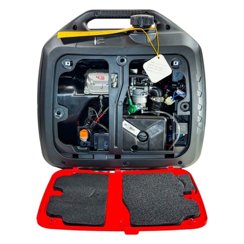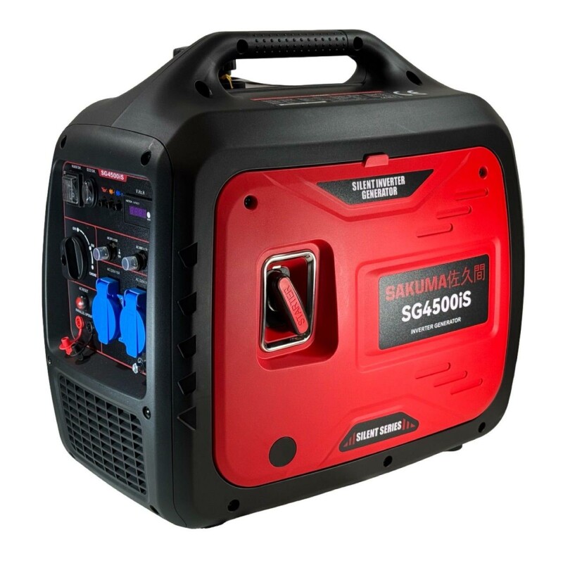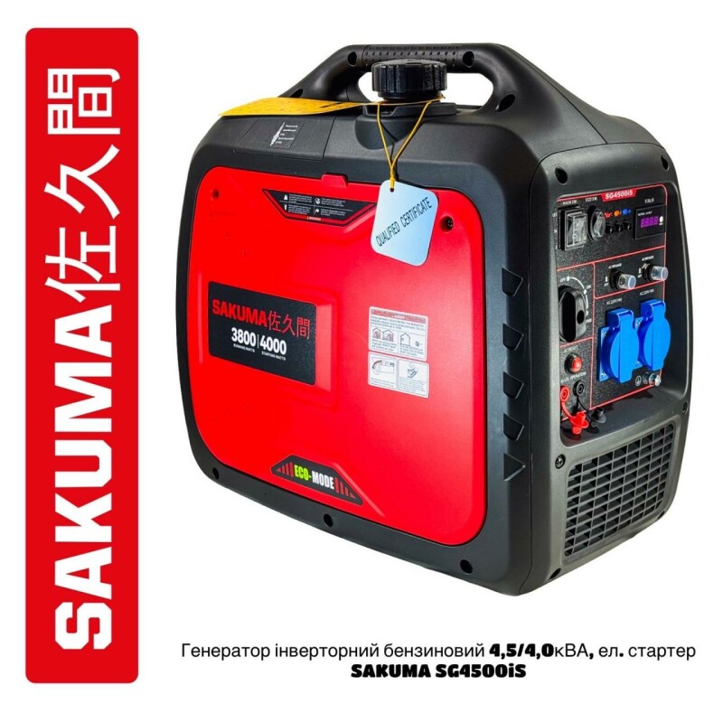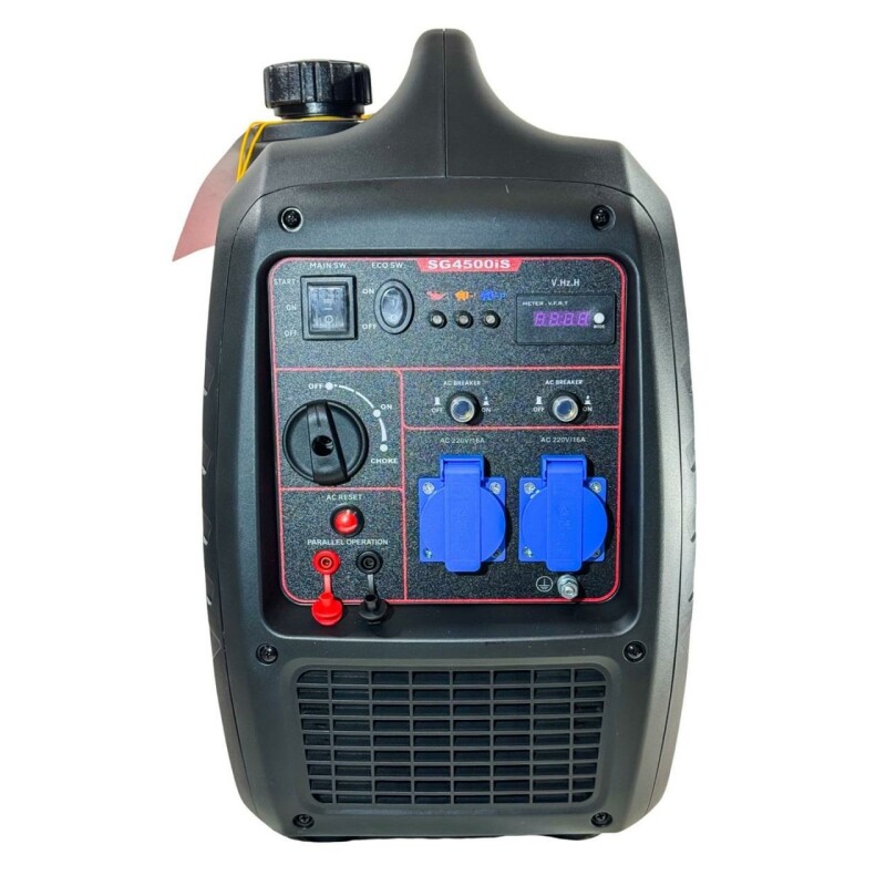 Инверторный бензиновый генератор SAKUMA SG4500iS. Преимущества ● Инверторный бензиновый генератор SAKUMA SG4500iS, оснащен инверторным блоком с микропроцессорным управлением контролирует работу генератора, обеспечивает максимально стабильное частоту 50 Гц и постоянное напряжение 230 В для надежной работы чувствительной и высокоточной электроники. ● Ротор и статор имеет медную обмотку. ● Индикатор низкого уровня масла. ● Индикатор перегрузки. ● Счетчик моточасов с дисплеем, также отображающий, напряжение и частоту. ● Чистая синусоида, коэффициент аберрации формы волны <2,5%, идеально подходит для запитывания приборов с чувствительной электроникой. ● Переключатель перевода генератора в экономичный режим. ● Розетка для параллельной синхронизации, дает возможность подключить второй генератор и получить на выходе до 9 кВА (Кабель для параллельной синхронизации не входит в комплект к генератору).. ● Легкий вес, всего 26кг. Технические характеристики Частота переменного тока: 50Гц. Напряжение переменного тока: 230В. Пиковая мощность: 4,5кВА, (4,0кВт). Номинальная мощность: 3,8кВА, (3,5кВт) Система запуска: электро / ручная. Емкость топливного бака: 7,0л Общий удельный расход топлива: 0,32л/кВтч Розетка переменного тока: 220В / 16А 2шт. Розетка постоянного тока USB: 3В / 2,1А. Уровень шума при нагрузке 50% на расстоянии 7м: 63дБ(А) Модель двигателя: SGE160i Мощность двигателя. 6,5л.с. Рабочий объем: 160куб.см Тип двигателя: 4-тактный, с верхним расположением клапанов. Система зажигания: транзисторная Система охлаждения: принудительная воздушная Емкость масла: 0,6л Габариты: 585х390х557мм. Вес 26/29кг. Гарантия 12мес. Страна регистрации бренда - Япония. Комплектация ● SG4500iS Инверторный бензиновый генератор. ● Свечной ключ - 1шт. ● Лейка для масла - 1шт. ● Инструкция по эксплуатации - 1шт.