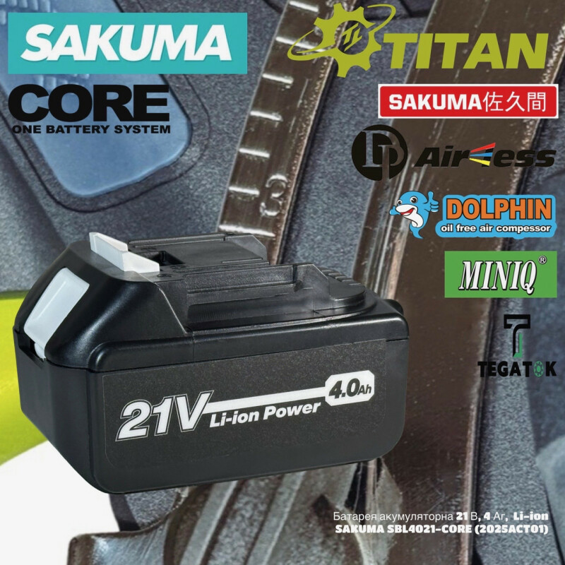 Аккумуляторная батарея SYSTEM CORE 21. SAKUMA SBL4021-CORE. Технические характеристики Рабочее напряжение аккумулятора: 18-21 В. Емкость аккумулятора: 4.0 А/ч. Технология аккумуляторных элементов: 18650 Li-Ion . Количество элементов: 10. Емкость элемента: 2,0 Ач. Напряжение элементов: 3,6 В. Совместимость: SYSTEM CORE 21. Защита от перегрева: Есть. Защита от переразряда: Есть. Защита от перезаряда: Есть. Защита от короткого замыкания: Есть. Поддержка быстрой зарядки: Есть. Время заряда на зарядном у-ве PQC2112-CORE: 180 мин. Время заряда на зарядном у-ве PQC21-CORE: 120 мин. Время заряда на зарядном у-ве SQC21-CORE: 120 мин. Время заряда на зарядном у-ве SQC2104-CORE: 60 мин. Время заряда на зарядном у-ве SQC2106-CORE: 40 мин. Вес батареи: 0,55 кг. Гарантия на батарею: 3 мес. Преимущества ● Аккумуляторная батарея SBL4021-CORE совместима со всеми инструментами системы TITAN CORE 21, а так же с помощью системы адаптеров, можно использовать со всеми инструментами 18-21В, почти всех производителей аккумуляторного инструмента (адаптеры поставляются опционно). Дополнительная информация: ● TM "SAKUMA" 2200 Fukaya, Kasumigaura, Ibaraki 300-0134, Japan / 2200深谷市、 霞ヶ浦町300から0134、日本 ● Модель: SBL4021-CORE. ● Артикул: 2025ACT01.